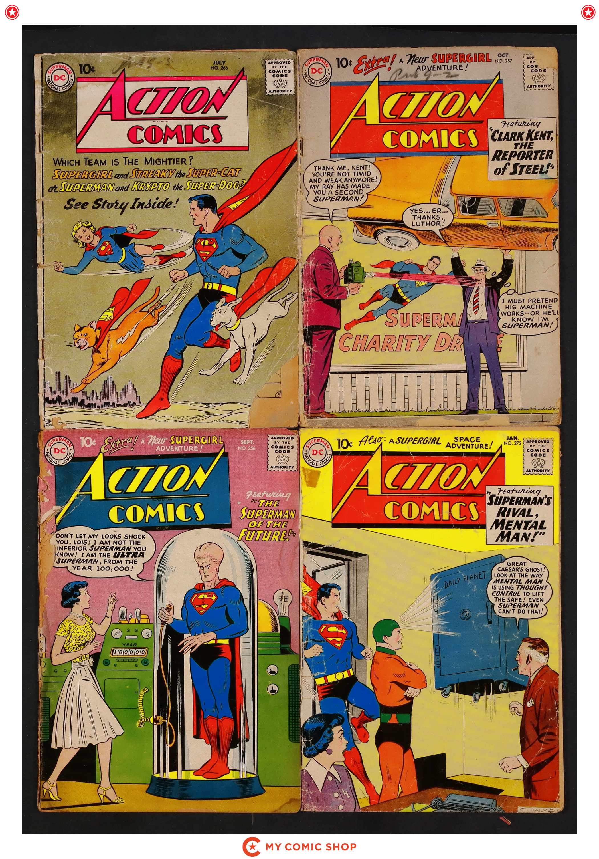 Issues 256, 257, 266, and 272 of Action Comics (1938 DC). Most will grade in the FR range with #272 grading PR (ad page missing, does not affect story or art).