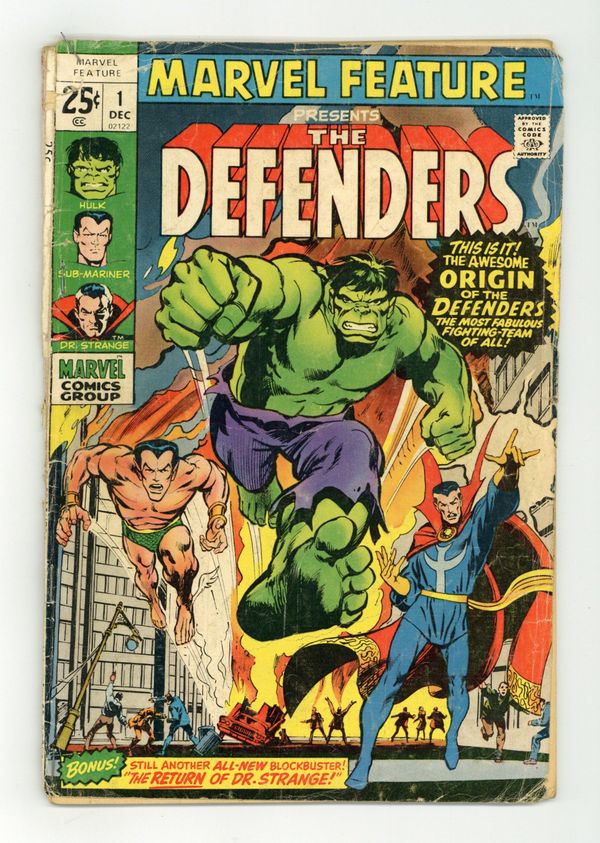 Ended Aug 11 2025 Bid History 8 bids Winning Bid $24 Giant-size issue; 1st appearance and origin of the Defenders (featuring Sub-Mariner, Hulk, and Doctor Strange). Cover by Neal Adams. "The Day of the Defenders!," script by Roy Thomas, pencils by Ross Andru, inks by Bill Everett; The Defenders must stop Yandroth from destroying the Earth with the Omegatron. "The Sub-Mariner and the Icebergs" featuring Namora, Tha-Korr, and Byrrah, script and art by Bill Everett. "The Return!," script by Roy Thomas, pencils by Don Heck, inks by Frank Giacoia; Stephen Strange becomes Doctor Strange again to stop Baron Mordo. 52 pgs., full color. $0.25. Cover price $0.25. Grade: PR 0.5 explanation of grade Condition: Used (collectible)