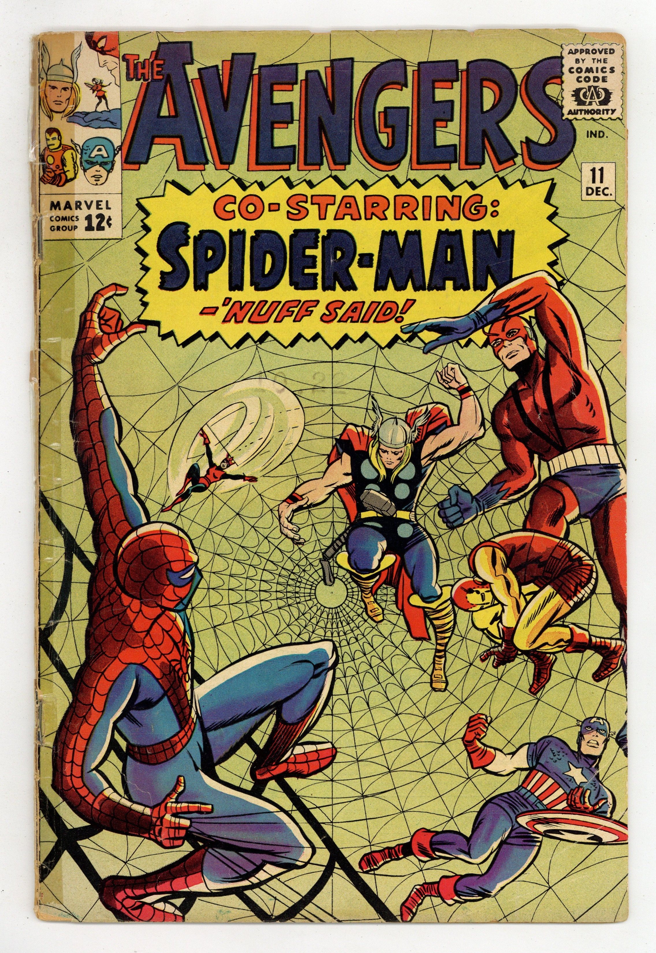Ended Jun 15 2025 Winning Bid $24 Cover pencils by Jack Kirby, inks by Chic Stone. The Mighty Avengers Meet Spider-Man, script by Stan Lee, pencils by Don Heck, inks by Chic Stone; Kang creates a robotic Spider-Man and sends him back in time to battle the Avengers. Roster: Captain America, Thor, Giant-Man, Wasp, and Rick Jones. Guest stars the Amazing Spider-Man. Villain: Kang. Cameo appearances by Zemo, the Executioner, Wonder Man, Dr. Doom, Magneto, Mysterio, the Unicorn, and Kraven the Hunter (all in Kang's files). Kang pin-up. 36 pgs. $0.12. Cover price $0.12. Grade: PR 0.5 explanation of grade Condition: Used (collectible)