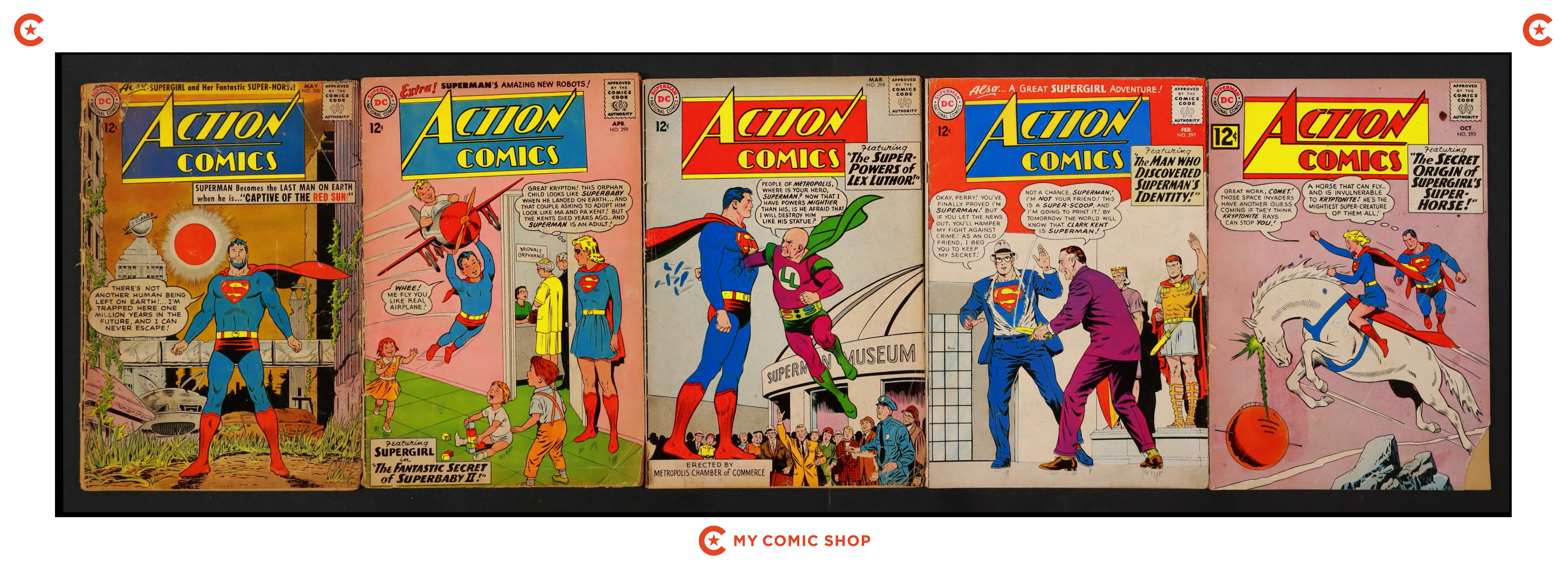 Issues 293 and 297-300 of Action Comics (1938 DC). Most will grade in the GD to FR range.