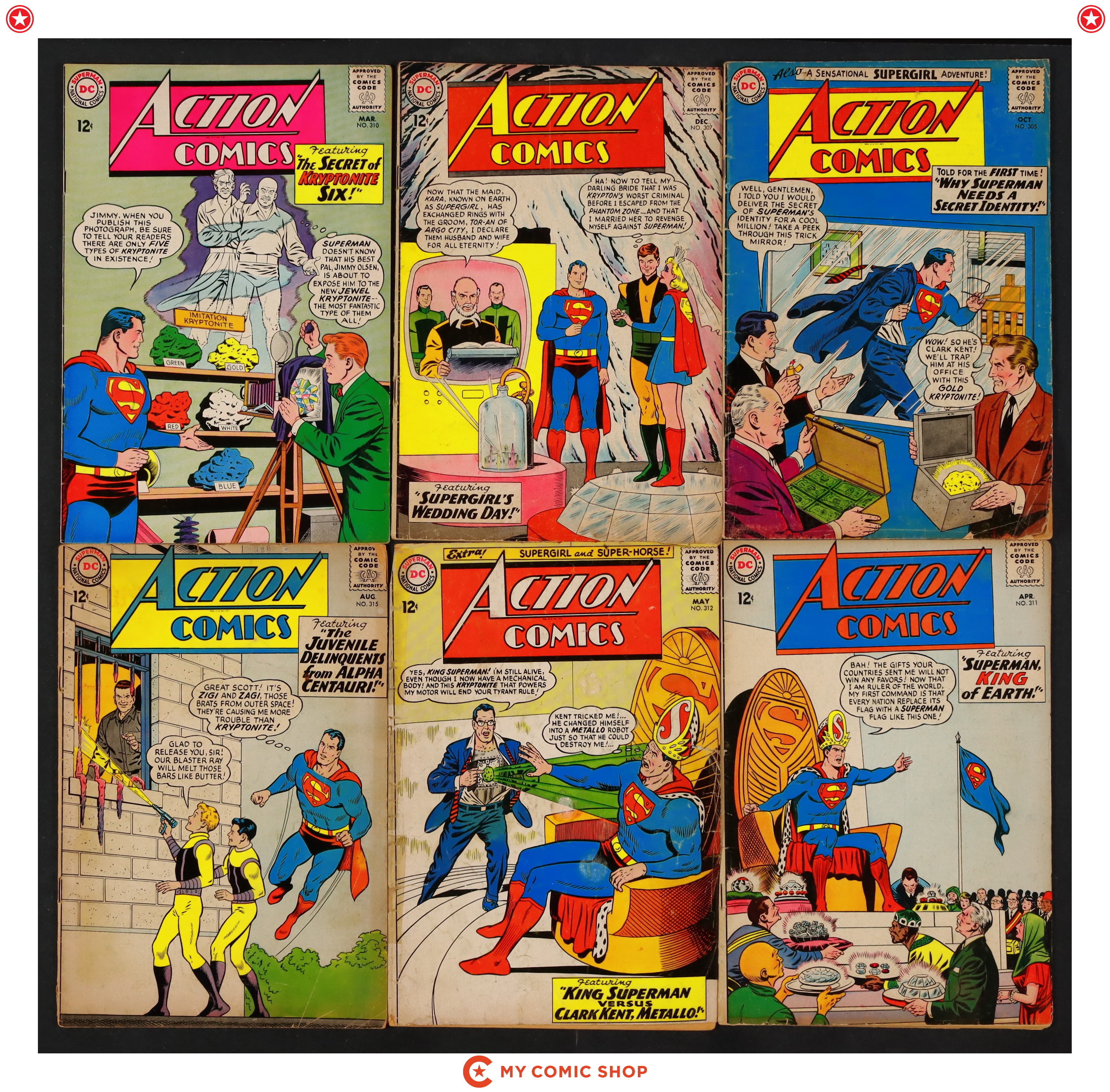 Issues 304-309 of Action Comics (1938 DC). Most will grade in the GD range.