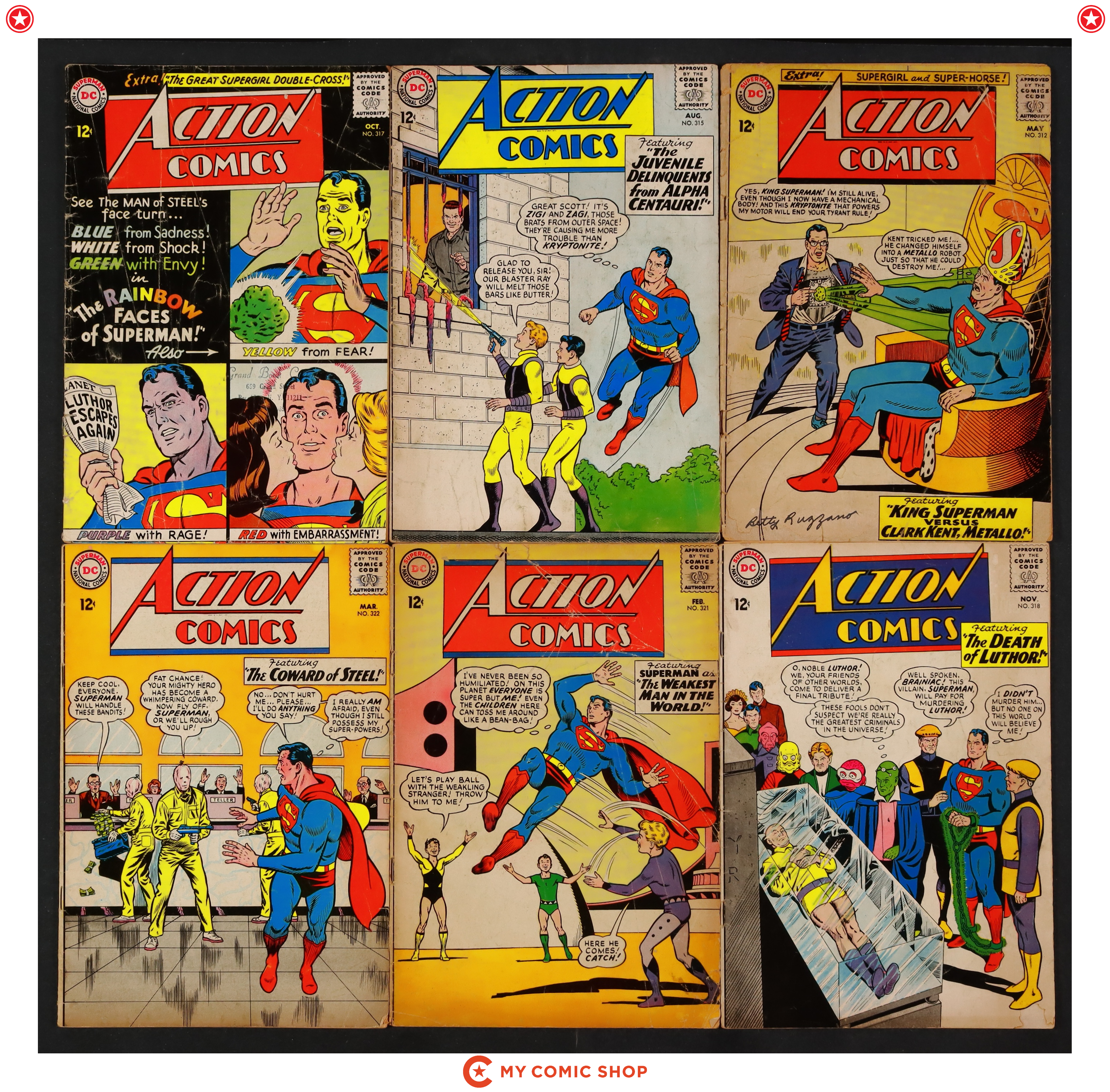 Issues 312, 315, 317, 318, 321, and 322 of Action Comics (1938 DC). Most will grade in the GD range with #312 grading PR (centerfold missing, does not affect story or art).
