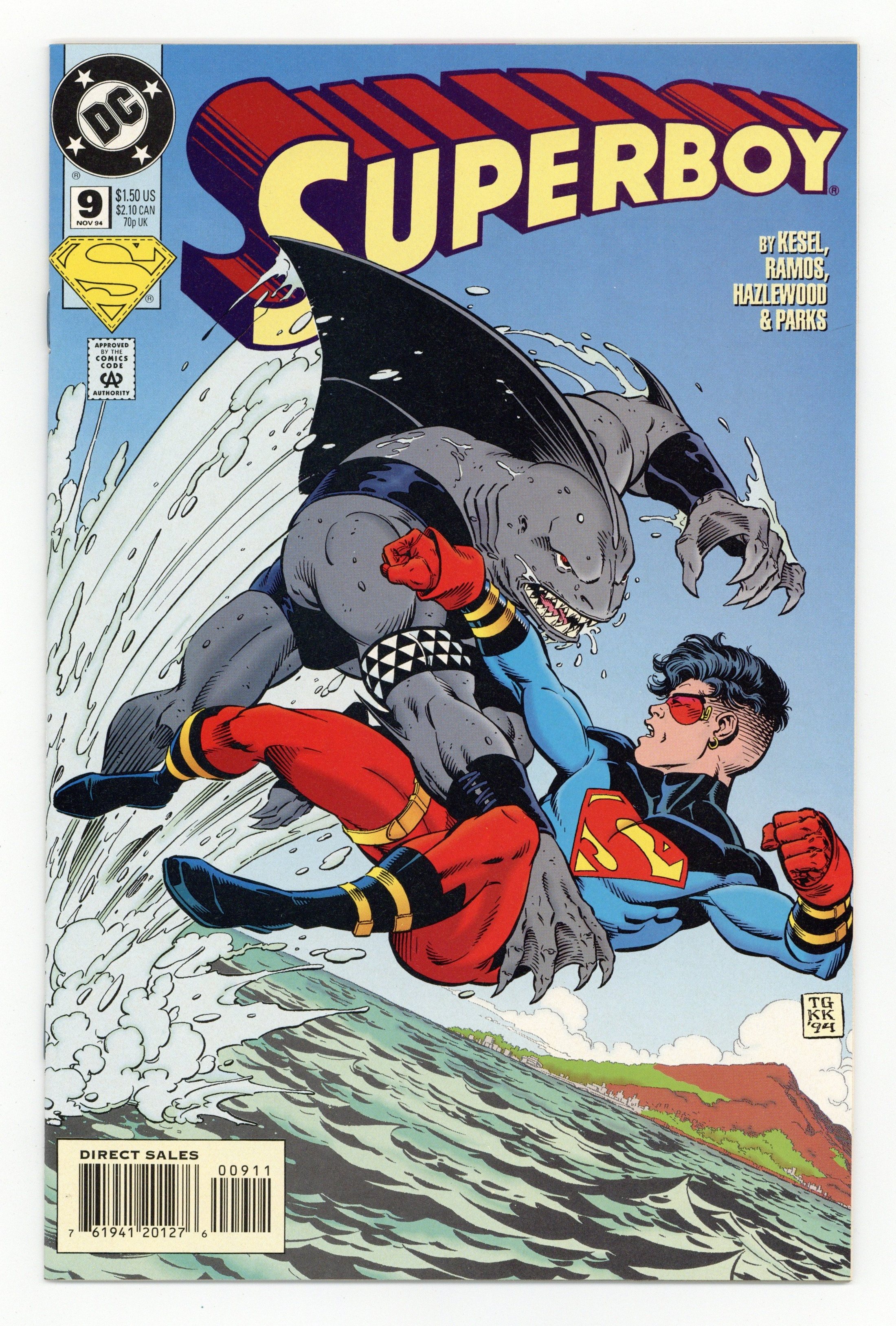 Ended Nov 24 2025 Bid History 7 bids Winning Bid $41 Direct Edition. "King Shark!" Story by Karl Kesel. Art by Humberto Ramos, Doug Hazlewood, and Ande Parks. Superboy battles Aquaman's nemesis, King Shark, off the coast of Hawaii. Plus, learn the mysterious origin of this truly unique villain. Cover price $1.50. Grade: NM 9.4 explanation of grade Condition: Used (collectible)