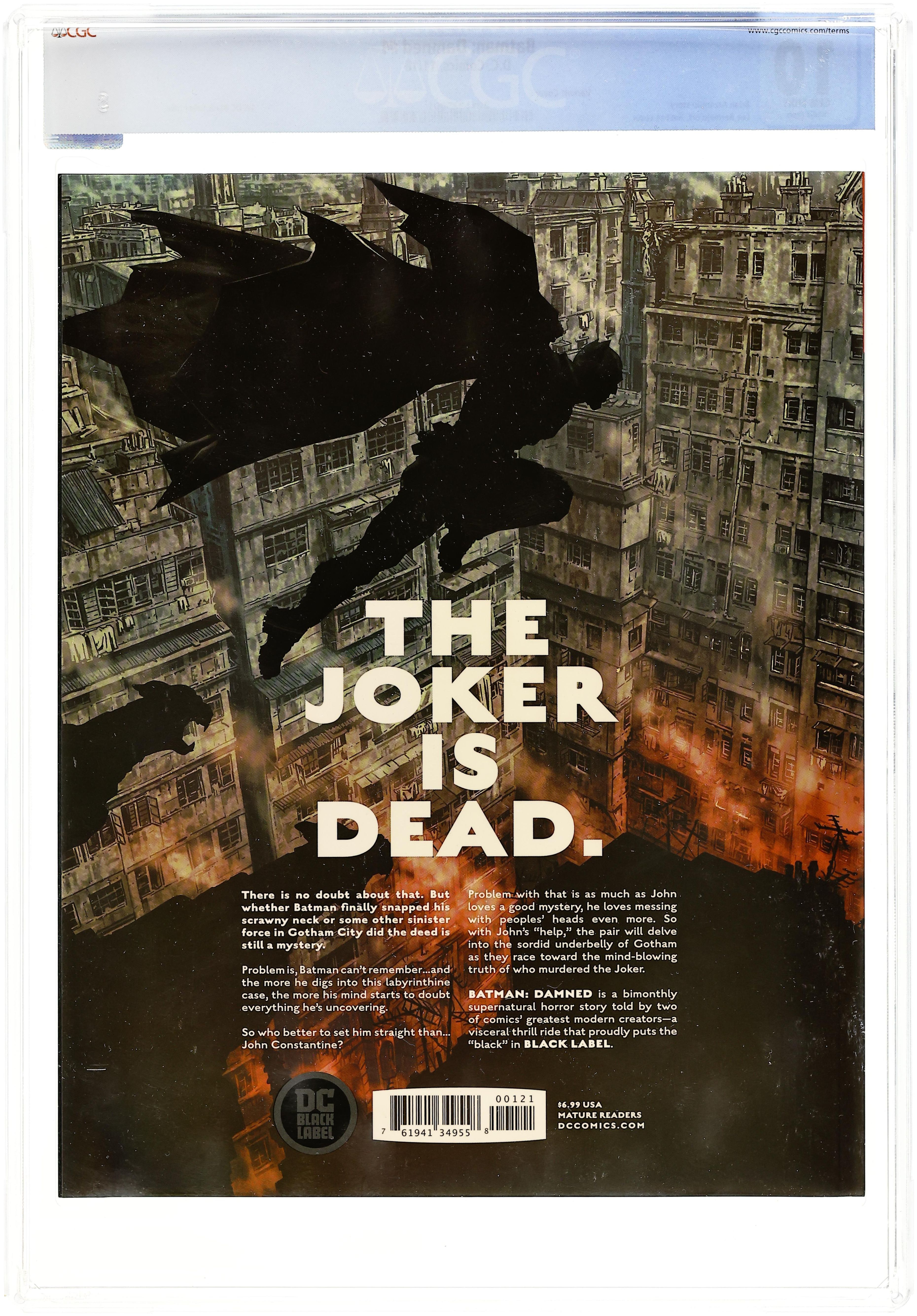Ended Jun 16 2025 Winning Bid $215 Written by Brian Azzarello. Art by Lee Bermejo. Cover by Jim Lee. DC BLACK LABEL, the highly anticipated new imprint from DC Comics, starts here! The Joker is dead. There is no doubt about that. But whether Batman finally snapped his scrawny neck or some other sinister force in Gotham City did the deed is still a mystery. Problem is, Batman can't remember… and the more he digs into this labyrinthine case, the more his mind starts to doubt everything he's uncovering. So who better to set him straight than… John Constantine? Problem with that is as much as John loves a good mystery, he loves messing with people's heads even more. So with John's 'help,' the pair will delve into the sordid underbelly of Gotham as they race toward the mind-blowing truth of who murdered The Joker. BATMAN: DAMNED is a bimonthly super-natural horror story told by two of comics' greatest modern creators-a visceral thrill-ride that proudly puts the 'black' in BLACK LABEL. 48 pages, full color. Mature Readers Cover price $6.99. Grade: CGC 10.0 explanation of grade Condition: Used (collectible)