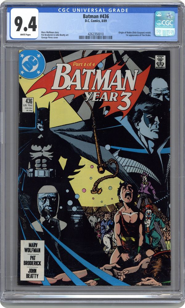 Ended Jul 1 2025 Winning Bid $35 First Printing. Direct Edition. 1st appearance of Tim Drake. Cover art by George Perez. "Batman Year 3 (Part 1 of 4): Different Roads," script by Marv Wolfman, pencils by Pat Broderick, inks by John Beatty; Someone is killing off Gotham's mob bosses, and Batman keeps arriving too late to prevent the murders; Boss Zucco is up for parole, and Alfred Pennyworth pleads with the parole board not to let him free; Nightwing returns to Gotham, having heard that Batman's sanity is eroding, and sets off in search of his mentor; The Post-Crisis origin of Robin (Dick Grayson) in flashback. 36 Pages, Full Color. Cover price $0.75. Grade: CGC 9.4 explanation of grade Condition: Used (collectible)