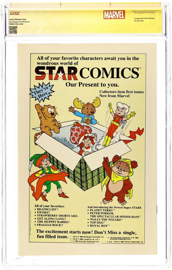 Ended Jun 30 2025 Winning Bid $205 Canadian edition with $.75 cover price. "Til Death Do Us Part!" Story by Louise Simonson. Art by Greg LaRocque and Jim Mooney. Painted cover by Charles Vess. The alien symbiote (aka black costume) ambushes Peter Parker while he is getting dressed. Now Spider-Man must battle the black costume and the new Vulturions on his way to the Baxter Building! Meanwhile, Aunt May laments Peter's decision to drop out of graduate school. (Note: The Web of Spiderman series essentially replaced the Marvel Team-Up title as Marvel's third regular series featuring Spider-Man.) 36 pages. Colored. Newspaper Stock. Canadian Edition. Cover price $0.75. Grade: CGC 8.0 explanation of grade Condition: Used (collectible)