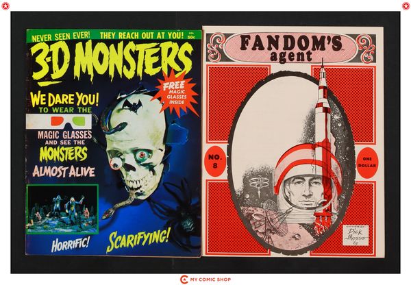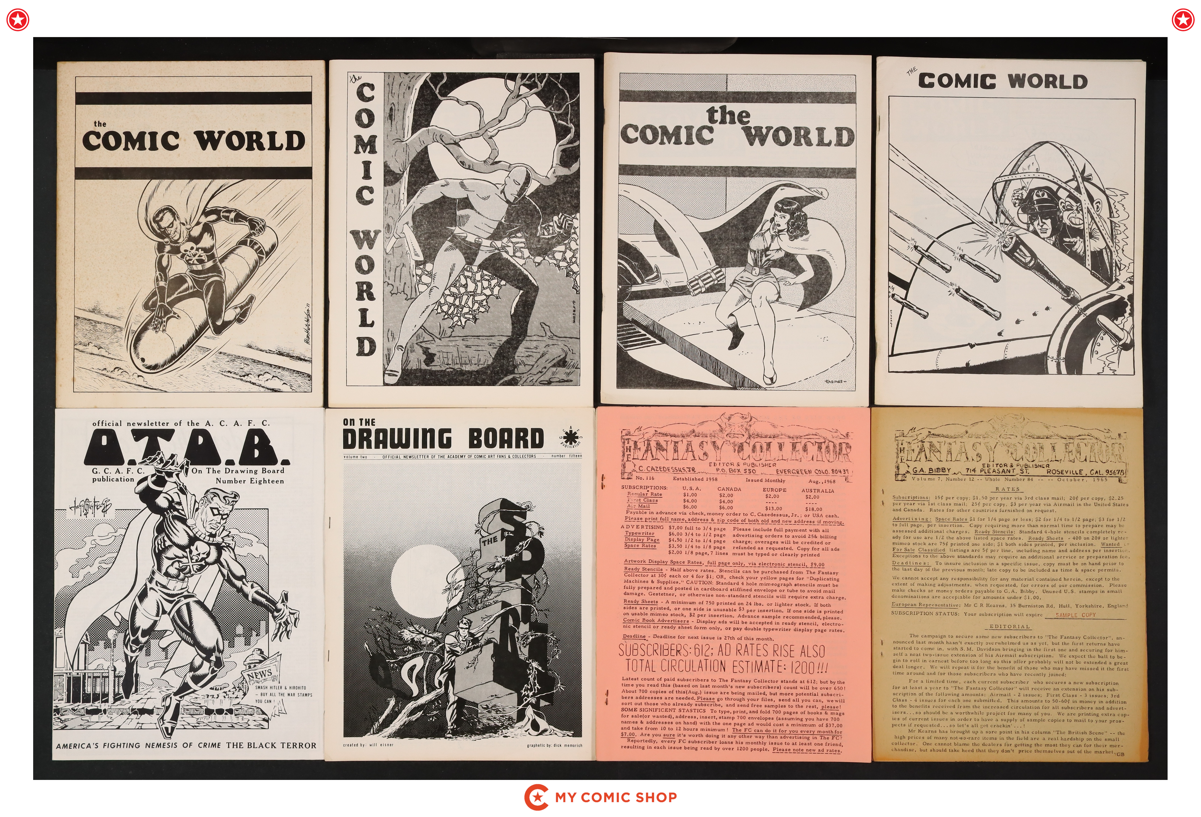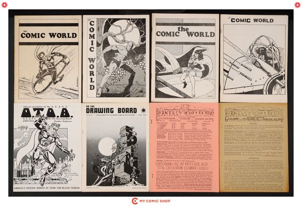 Issues 8, 10, 11, 14 of Comic World (1962 Robert Jennings) Fanzine; 84, 116 of Fantasy Collector (1958-1976 Camille Cazedessus) Fanzine; Fandom's Agent (1968) Fanzine 8; On the Drawing Board (1967 ACAFC) Fanzine Vol. 2 #15; Comic Reader (1961) 66; and 3-D Monsters (1964) 1N. Most will grade in the VG/FN to VF- range.