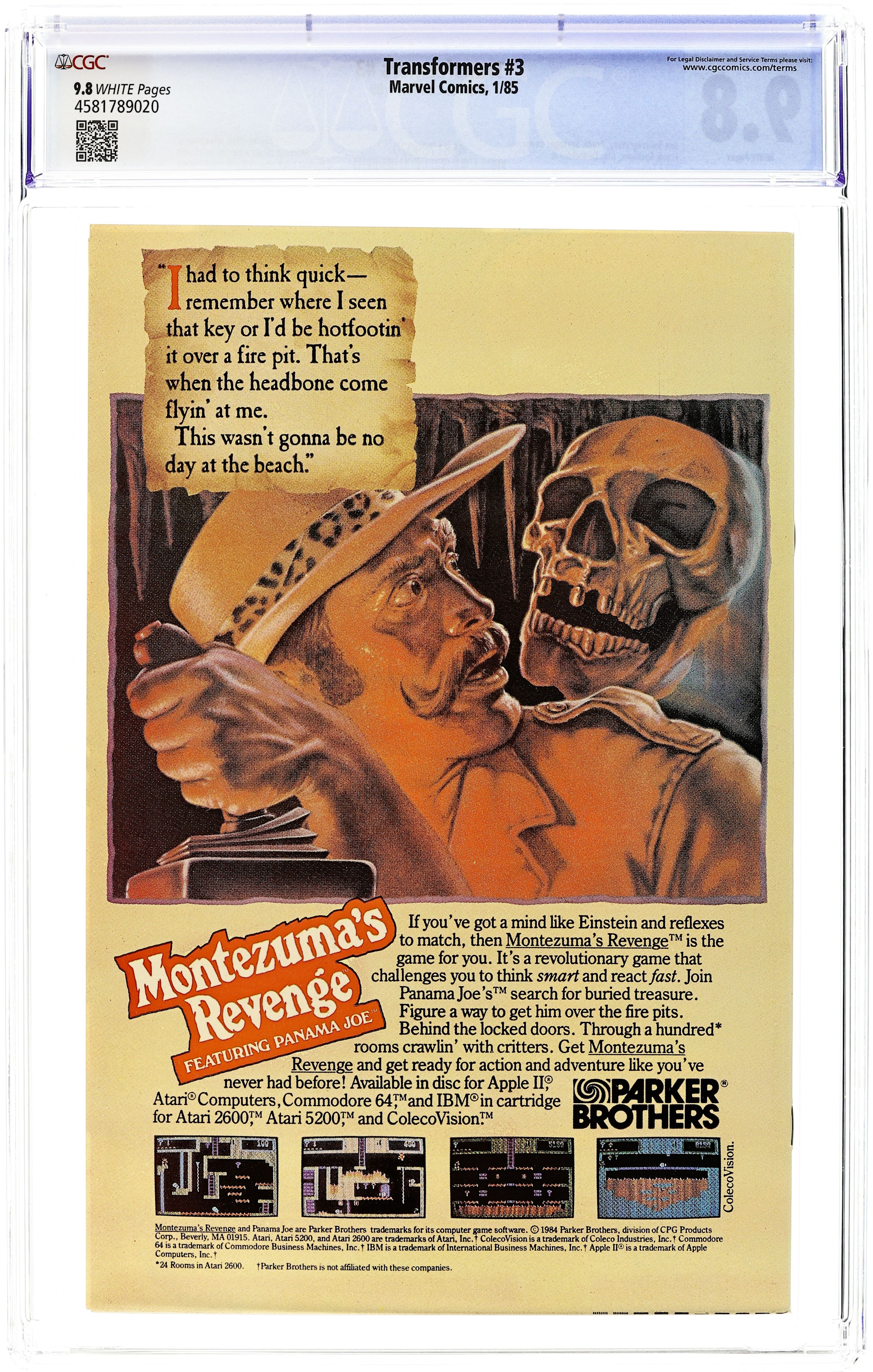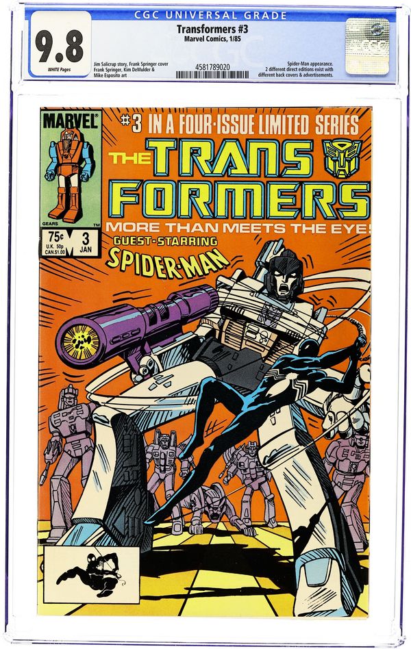 First Printing. Direct Edition. "Prisoner of War!" Part 3 of 4. Guest-starring the Amazing Spider-Man. Nick Fury cameo. Story by Jim Salicrup. Art by Frank Springer, Kim DeMulder and Mike Esposito. Cover by Mark Texeira. The Decepticons have taken control of a nuclear power plant. Now, with the world watching, the Autobots must stop their malevolent counterparts before it's too late. At least they'll get a little help from everyone's favorite Friendly Neighborhood Spider-Man. This is a first printing. All 2nd or 3rd printings have a 2nd, 3rd printing notice on inside at bottom of indicia on first/splash page. 2nd printings were done for most issues from #1 to #9. Cover price $0.75. Grade: CGC 9.8 explanation of grade Condition: Used (collectible)