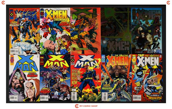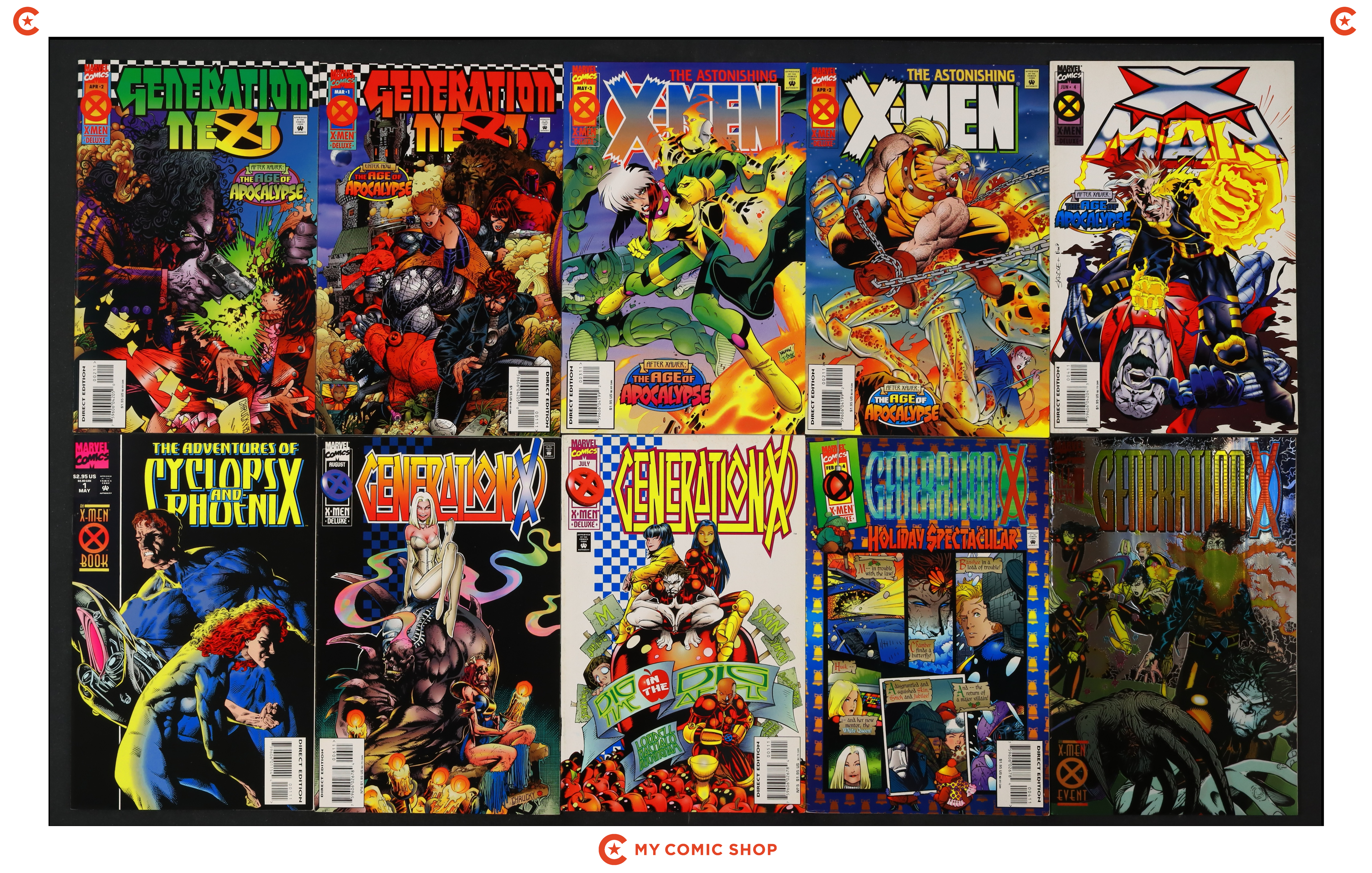 Issues 1A.D of X-Men Alpha (1995); 1 of X-Men Omega (1995); 1D of X-Men Prime (1995); 1 of X-Men Chronicles (1995 Marvel); 1A.D, 2, and 4D of Amazing X-Men (1995); 1-4 of X-Man (1995 Marvel); 2 and 3 of Astonishing X-Men (1995 1st Series); 1 and 2 of Generation Next (1995); 1, 4A, 5, and 6 of Generation X (1994); and 1 of Adventures of Cyclops and Phoenix (1994). Most will grade in the VF to FN range with a few grading VG.