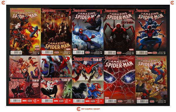 Issues 9A-15A of Amazing Spider-Man (2014 3rd Series); 1A, 2, and 3 of Spider-Verse Team Up (2014); 1A and 2 of Spider-Verse (2014); 1A of Scarlet Spiders (2014); 1A-3A and 4 of Spider-Woman (2014 Marvel 5th Series); and 6-8 of Spider-Man 2099 (2014 2nd Series). Most will grade in the NM to VF range.