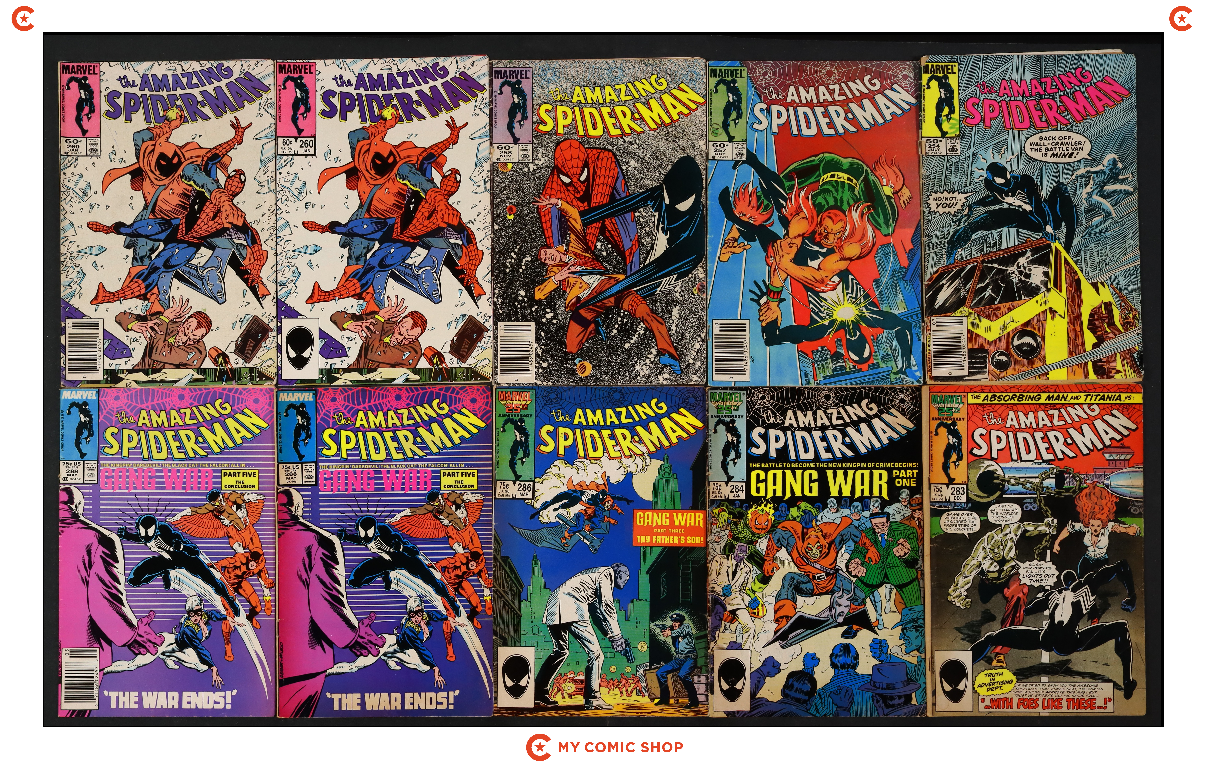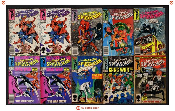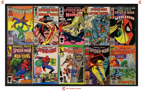 Issues 254N, 257N, 258N, 260D, 260N, 283D, 284, 286D, 288D, and 288N of Amazing Spider-Man (1963 1st Series); 129, 142, 146, and 147 of Marvel Team-Up (1972 1st Series); 158, 168, 169, 173, 177, and 204 of Marvel Tales (1964 Marvel). Most will grade in the GD range with a few grading VG.
