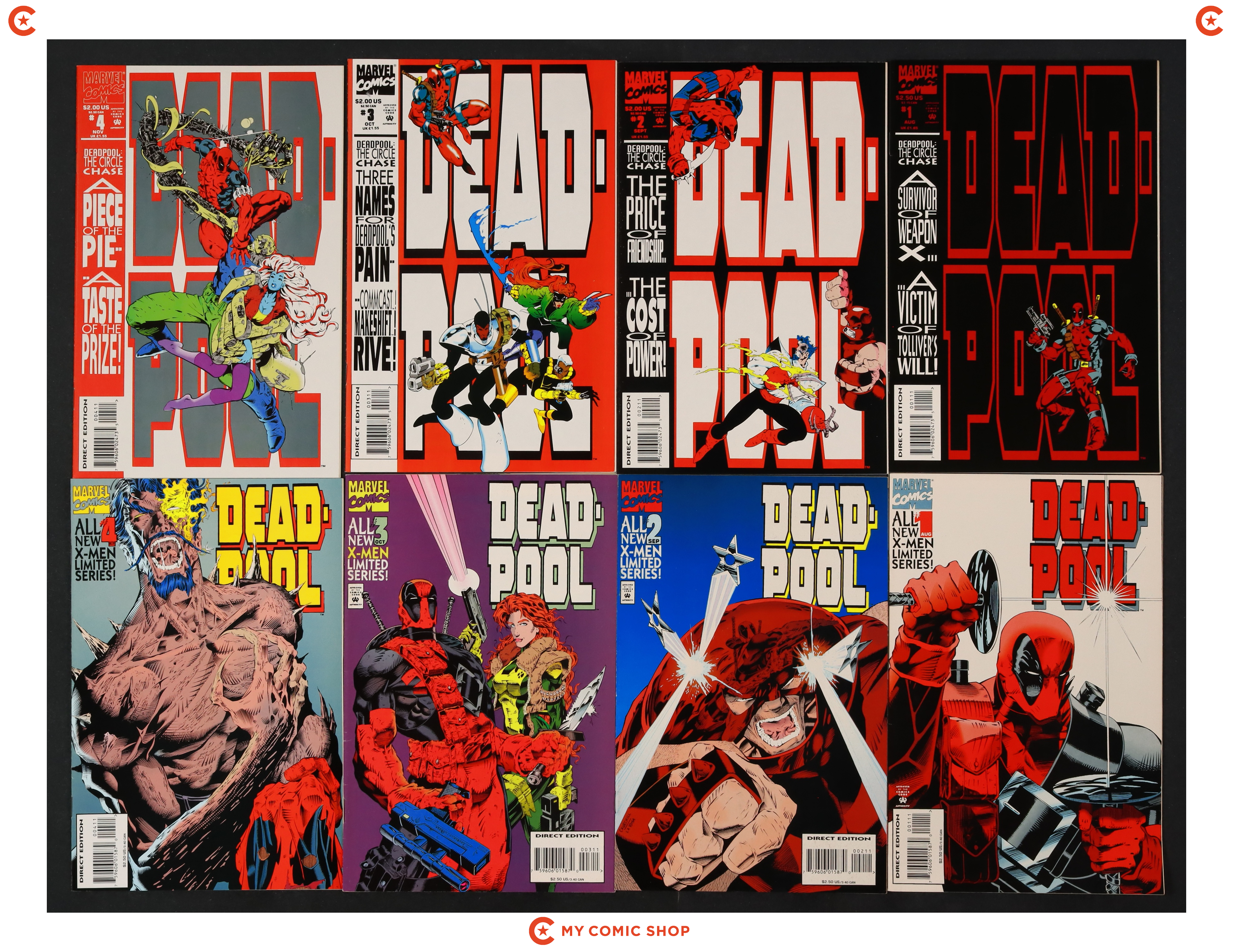Issues 1D-4D of Deadpool The Circle Chase (1993), and issues 1D-4D of Deadpool (1994 Mini Series). Most will grade in the FN to VF range.