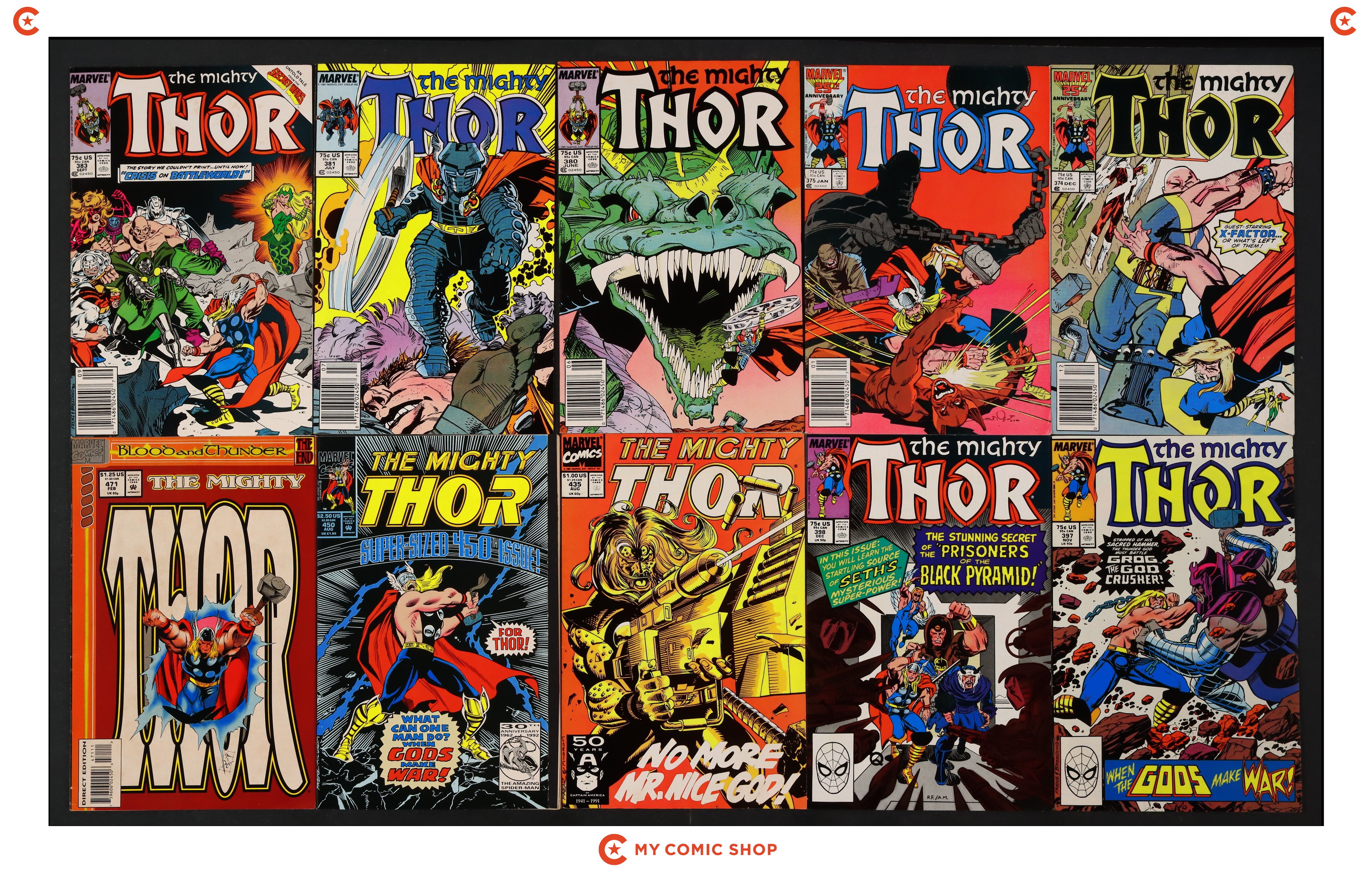 Issues 374, 375, 380, 381, 383, 397D, 398, 435, 450, and 471 of Thor (1962 Marvel 1st Series Journey Into Mystery). Most will grade in the FN range with a couple grading closer to VF.