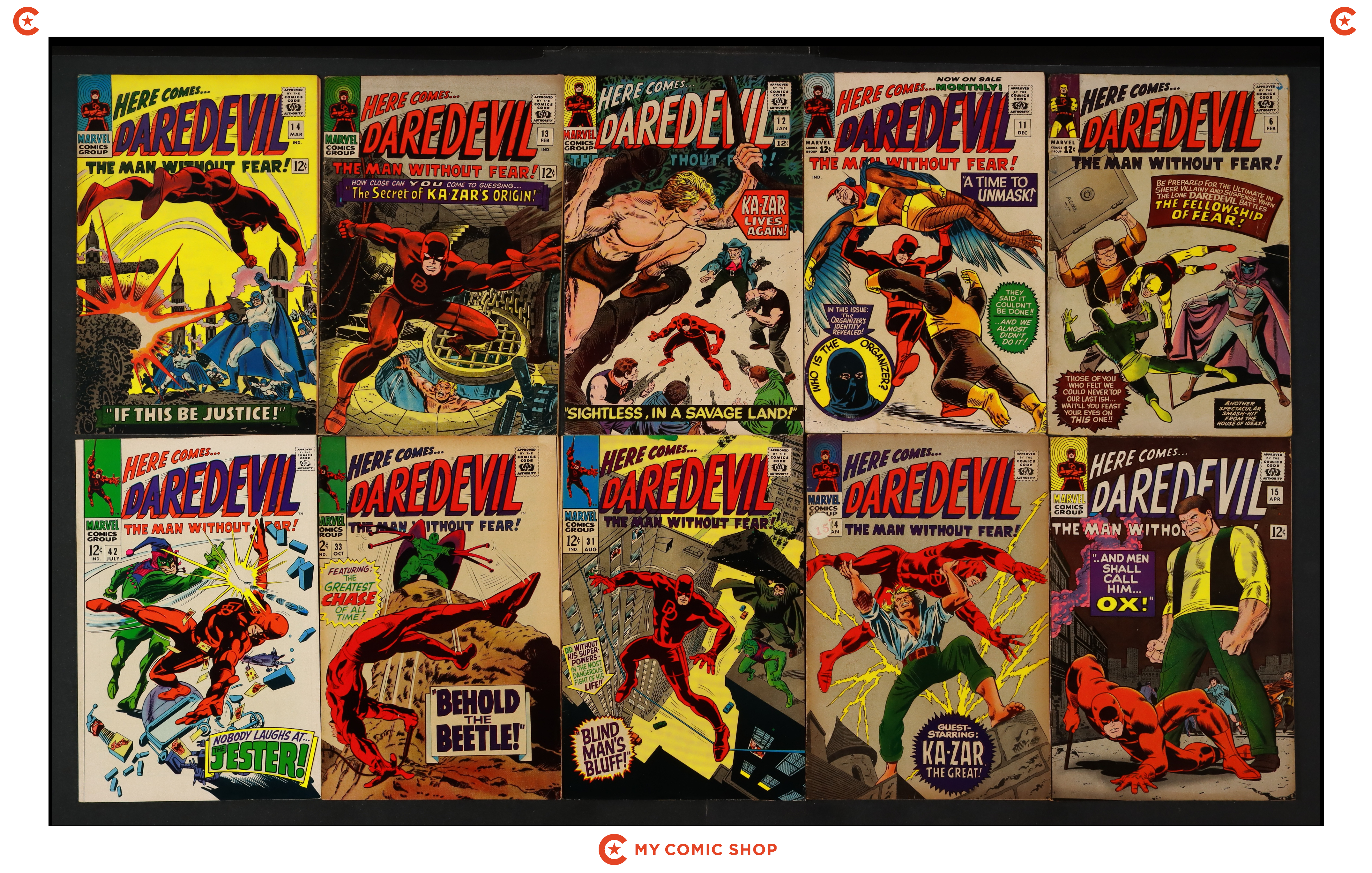 Issues 6, 11-15, 24, 31, 33, 42 of Daredevil (1964 1st Series). Most will grade in the GD/VG to VG/FN range, with 6 grading at PR (piece missing, interrupts art and story).