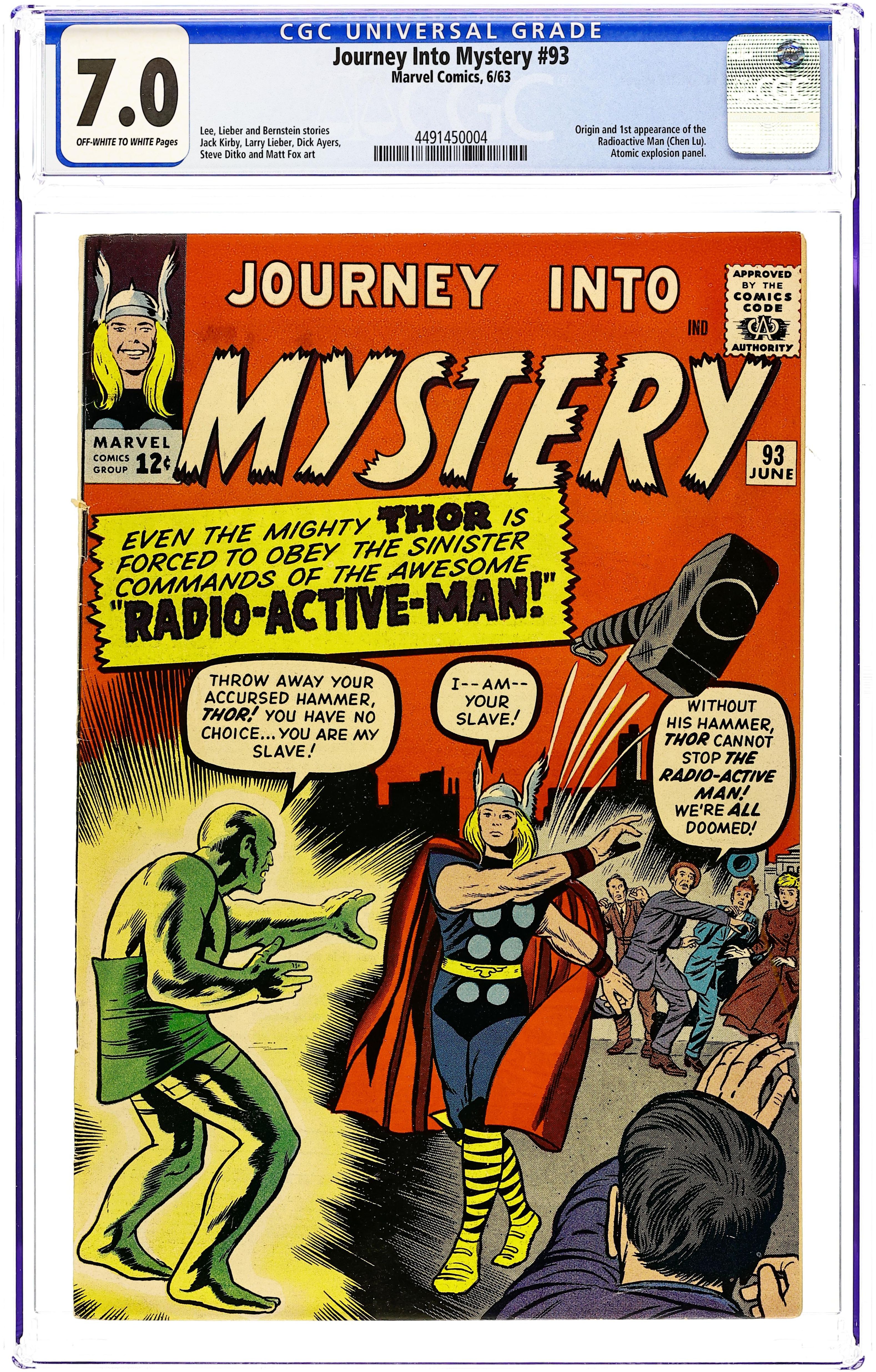 Cover pencils by Jack Kirby, inks by Dick Ayers. "The Mysterious Radio-Active Man!" (first appearance), script by Stan Lee (plot) and Robert Bernstein (script), pencils by Jack Kirby, inks by Dick Ayers; While on a medical mission to India, Dr. Blake becomes Thor to repel a Chinese attack; In order to fight Thor, a Chinese scientist irradiates himself to gain great power. "Over the Moon" two-page text story. "The Man Who Wouldn't Die!", script by Stan Lee (plot) and Larry Lieber (script), pencils by Larry Lieber, inks by Matt Fox; A selfish billionaire builds a fallout shelter deep beneath the Earth's surface, but when he insists on touring it alone he discovers a group of primitive humans that attack him and collapse the tunnel, trapping him. "I Saw a Martian!", script by Stan Lee, art by Steve Ditko; A man cannot convince the police that he saw an alien ship land. 36 pgs., full color. $0.12. Cover price $0.12. Grade: CGC 7.0 explanation of grade Condition: Used (collectible)