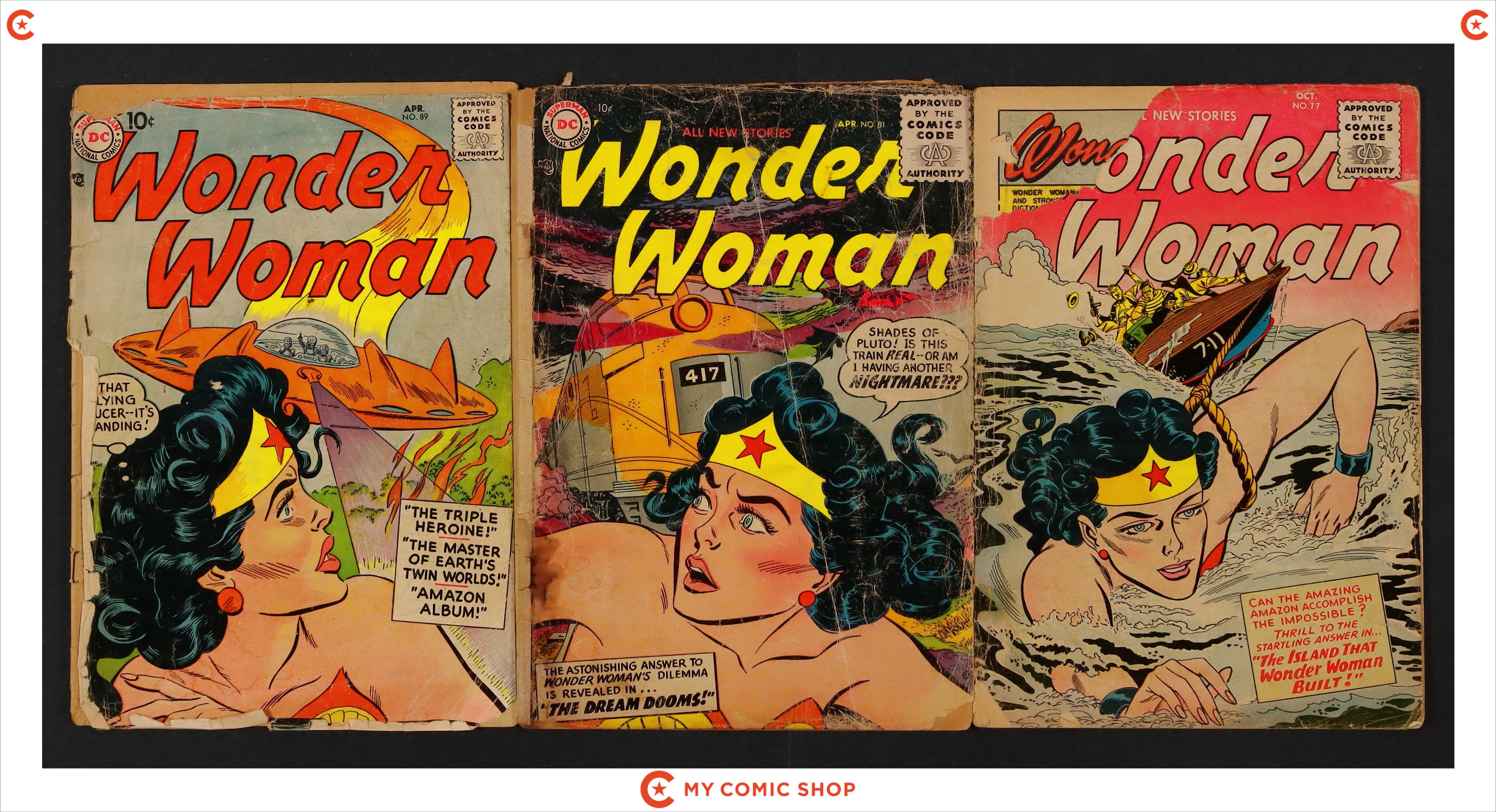 Issues 77, 81, 89 of Wonder Woman (1942 1st Series DC). Most will grade in the PR range; 77 (back cover missing), 81 (centerfold missing), 89 (back cover missing).