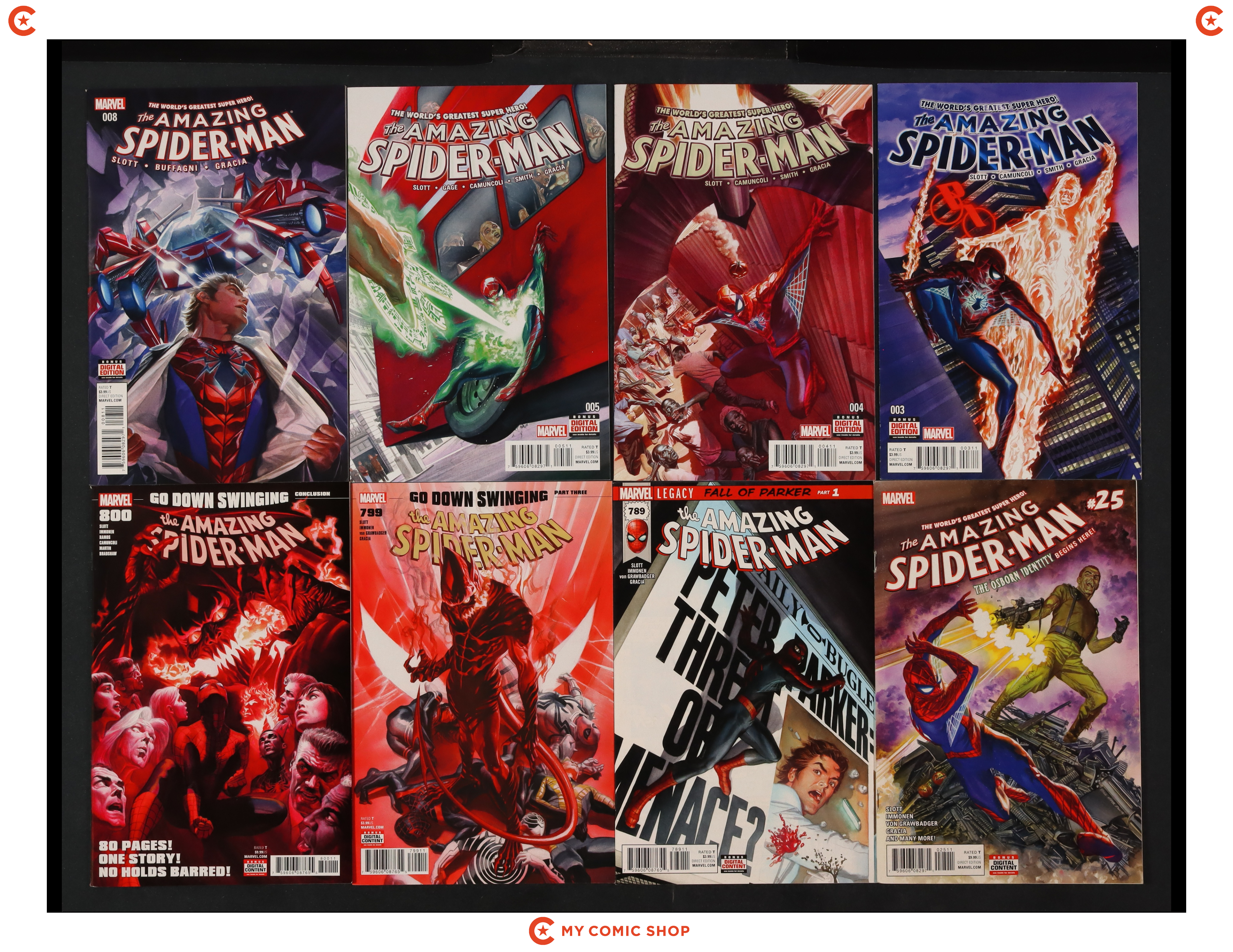 Issues 3A, 4, 5, 8A, 25A of Amazing Spider-Man (2015 4th Series); and 789A, 799A, 800A of Amazing Spider-Man (2017 5th Series); Most will grade in the VF to NM range.