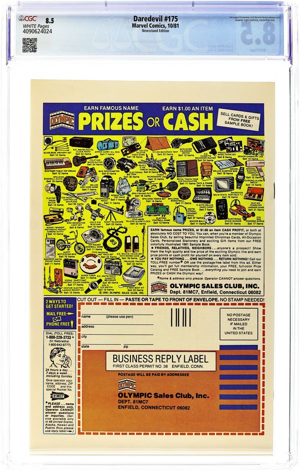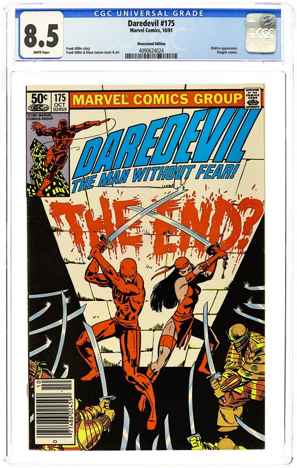Ended Jun 9 2025 Winning Bid $27 Newsstand Edition. Cover pencils by Frank Miller, inks by Klaus Janson. Gantlet, script by Frank Miller, pencils by Frank Miller (breakdowns) and Klaus Janson (finished art), inks by Klaus Janson; DD is without his radar sense and teamed-up with Elektra against the Hand and their master assassin, Kirigi; While Matt is off fighting ninja, Foggy is defending the Gladiator in court. Full page pin-up ad for Spider-Woman, pencils by Denys Cowan, inks by Al Milgrom. 36 pgs. Cover price $0.50. Cover price $0.50. Grade: CGC 8.5 explanation of grade Condition: Used (collectible)