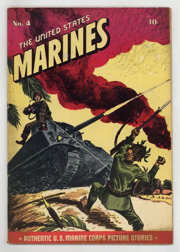 Stories and art by Chas. M. Quinlan and Tony DiPreta. Action-packed fact and fiction about the US Marine Corps, printed at the height of WWII patriotic fervor. Includes the note "Contents reviewed and cleared by the US Marine Corps." The true story of Red Shelton, war hero at the battle of Tarawa; Photos of Marines on duty overseas; Marines-based humor with "Monte Zuma and Trip O'Lee," a reference to the Marines' Hymn. Also featuring an ad for a glow-in-the dark necktie: "By day a lovely swank tie...By night a call to love in glowing words." No Flash in the Pan; The Heat's On!; Palau; Star Performance; Wild West in the East!; Guam; Saipan!; The Fighting Redhead; Monte Zuma and Trip O'Lee; Semper Fidelis and Sometimes Funny; Hero of Koromakina Lagoon; The Tanks of Tarawa; Leatherneck Lens; Split-Second Escapes; Who Goes There...?; Vanguard of Doom; Seagoing Bathtub; South Pacific Serenade. 48 pages, Full Color. Cover price $0.10. Grade: GD/VG 3.0 explanation of grade Condition: Used (collectible)