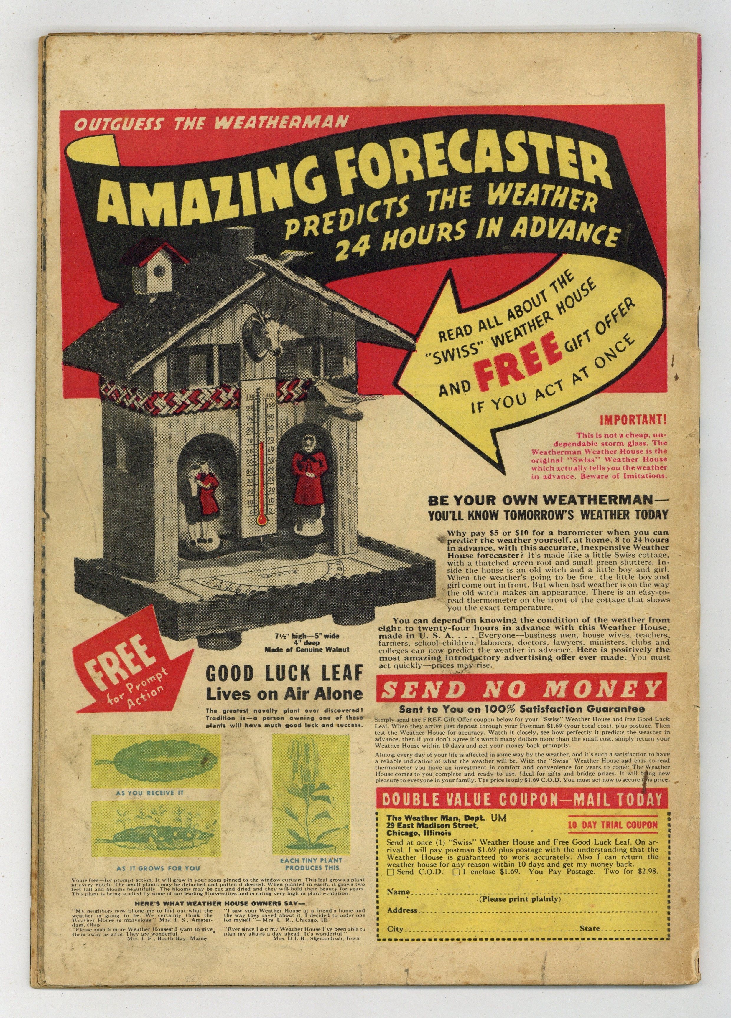 SOLD$120.00- Centerfold detached at one staple. Cover oxidation. Cover-to-cover edge tear.