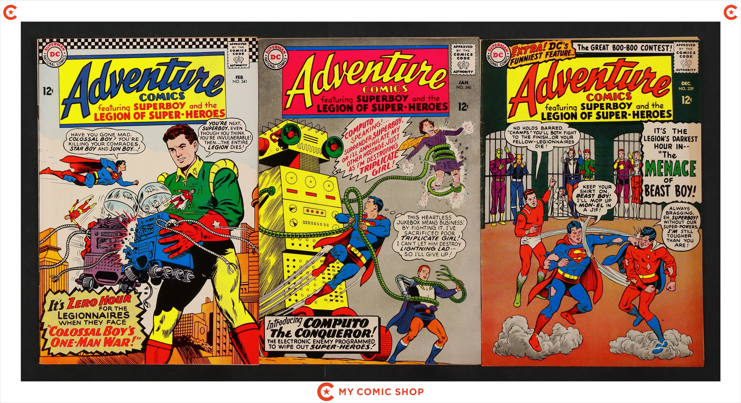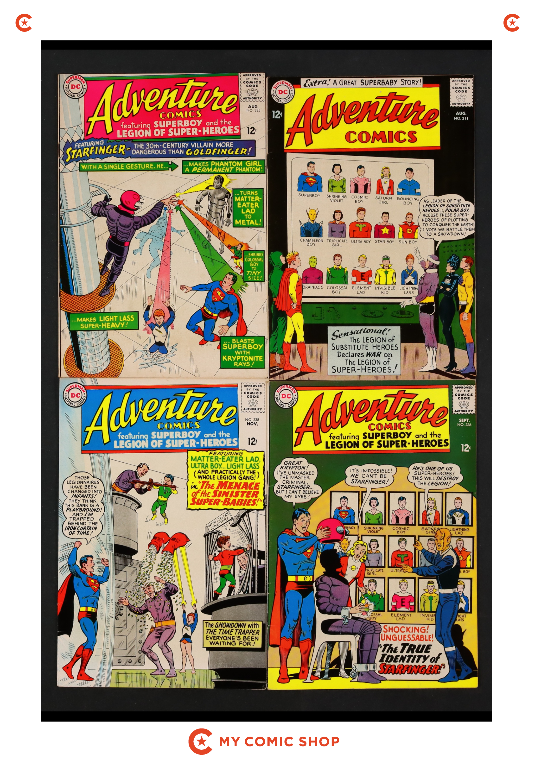 Issues 311, 335, 336, and 338-341 of Adventure Comics (1938 1st Series). Most will grade in the FN range with a few couple grading VG.