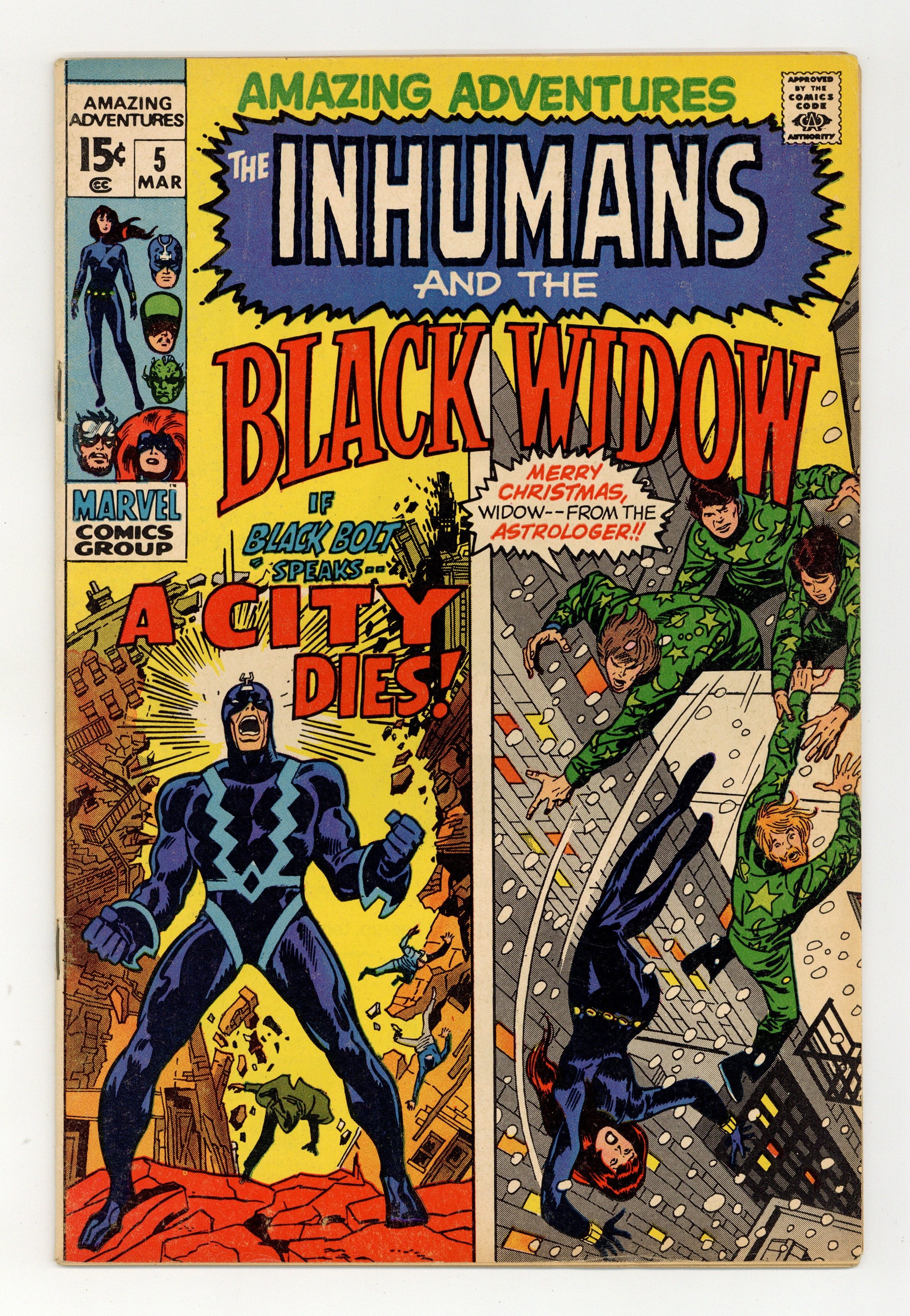 Ends Dec 8 7:13 PM CST Bid History 4 bids Current Bid $5 Your Secret Max Bid If you'd like to bid, please log in or register. Cover pencils by John Buscema, inks by John Verpoorten. "His Brother's Keeper!", script by Roy Thomas, pencils by Neal Adams, inks by Tom Palmer; Black Bolt realizes that Maximus has gained the power to blank men's minds and thus encases him within a stasis container and then leaves for America; The first group of people he comes across are criminals who are attempting to get a small boy to climb in through a building window and unlock it to burglarize it; Black Bolt easily defeats the criminals and aids the injured boy; Meanwhile, Gorgon and Karnak think their leader has gone too far in entombing Maximus and attempt to free him. "And To All a Good Night," script by Roy Thomas, pencils by Gene Colan, inks by Bill Everett; The Astrologer's goons are after a hippie from Utah, who knocks the Astrologer's henchmen who was attacking the Black Widow off a building with him. Letter to the editor from comic editor Paul Levitz. 36 pgs, full color. $0.15. Cover price $0.15. Grade: VG 4.0 explanation of grade Condition: Used (collectible)