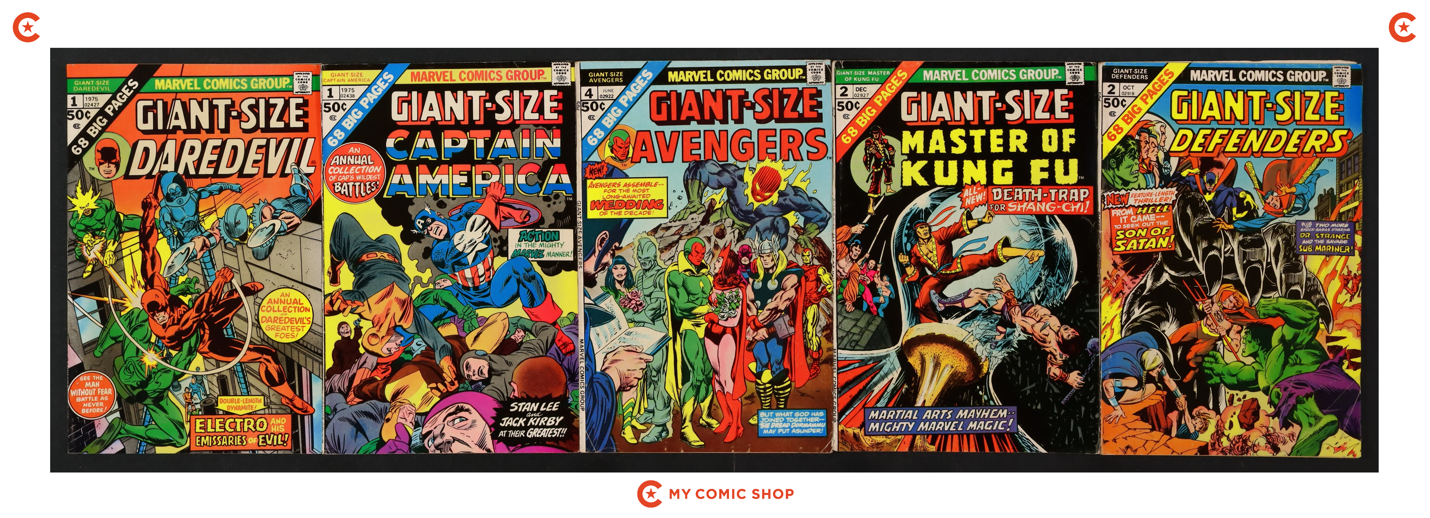 Issues Giant Size Defenders (1974) 2; Giant Size Master of Kung Fu (1974) 2; Giant Size Avengers (1974) 4; Giant Size Captain America (1975) 1; Giant Size Daredevil (1975) 1. Most will grade in the GD/VG to FN range.