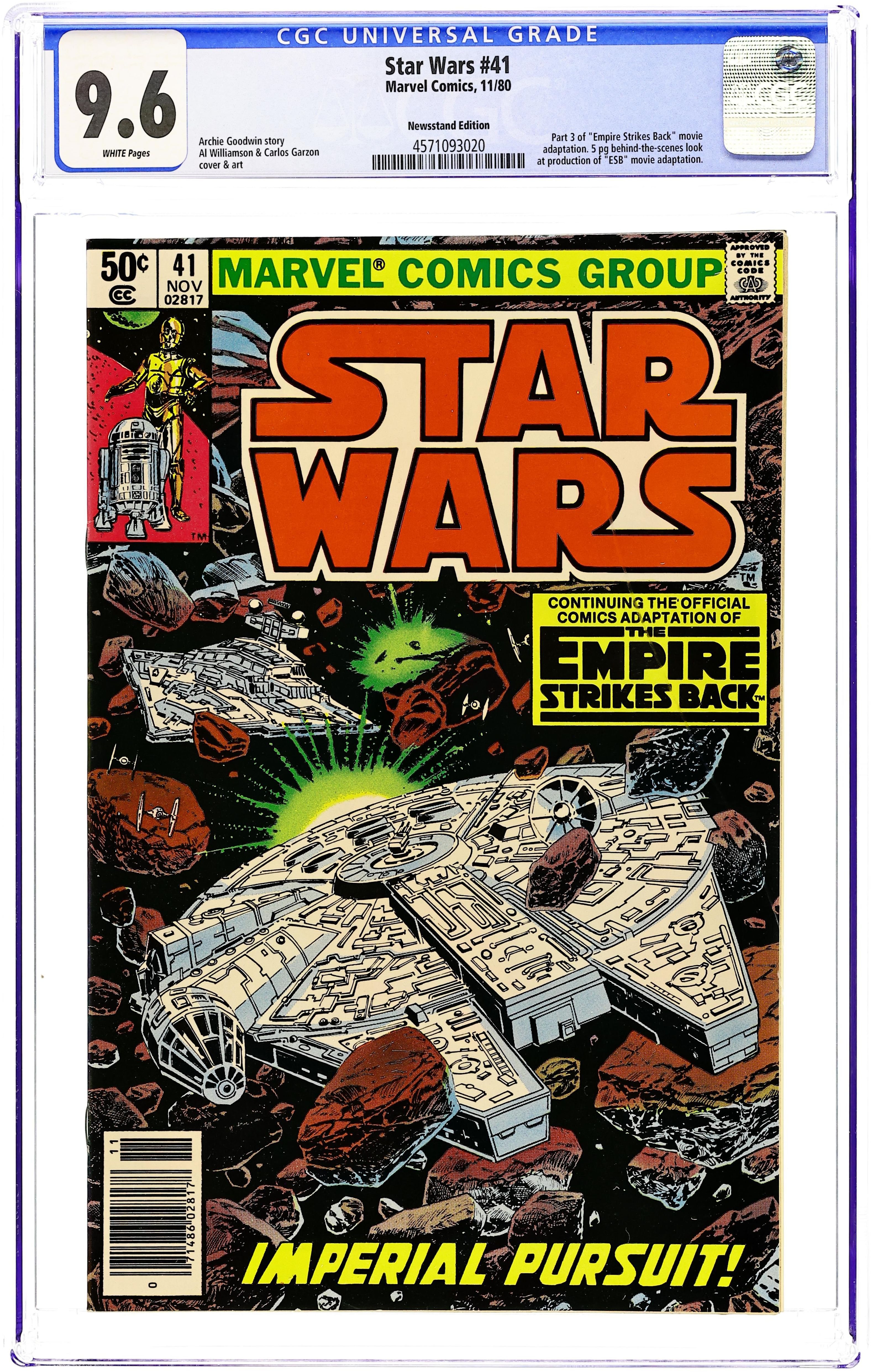 Newsstand Edition. The Empire Strikes Back: Part 3 of 6. "Imperial Pursuit!" Script by Archie Goodwin, art by Al Williamson and Carlos Garzon. Note: Part 3 of movie adaptation; based on the movie script; Williamson and Garzon both pencil and ink the art for this series. Plus: 5-page text article "Building an Empire--Marvel Style." Cover by Williamson and Garzon. Cover price $0.50. Grade: CGC 9.6 explanation of grade Condition: Used (collectible)
