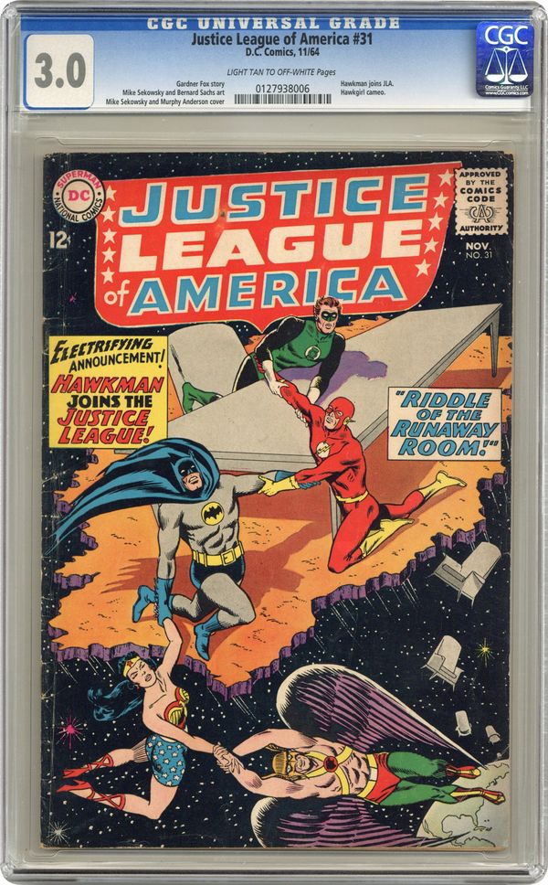 Cover pencils by Mike Sekowsky, inks by Murphy Anderson. Riddle of the Runaway Room!, script by Gardner Fox, pencils by Mike Sekowsky, inks by Bernard Sachs; Hawkman's first case as a member of the JLA involves low-level crook Joe Parry who has come into possession of an alien machine with which he creates three different threats against the JLA. Letter to the editor from comics writer Mike Friedrich. Rocky and Bullwinkle star in a one-page Cheerios ad. 36 pgs. $0.12. Cover price $0.12. Grade: CGC 3.0 explanation of grade Condition: Used (collectible)