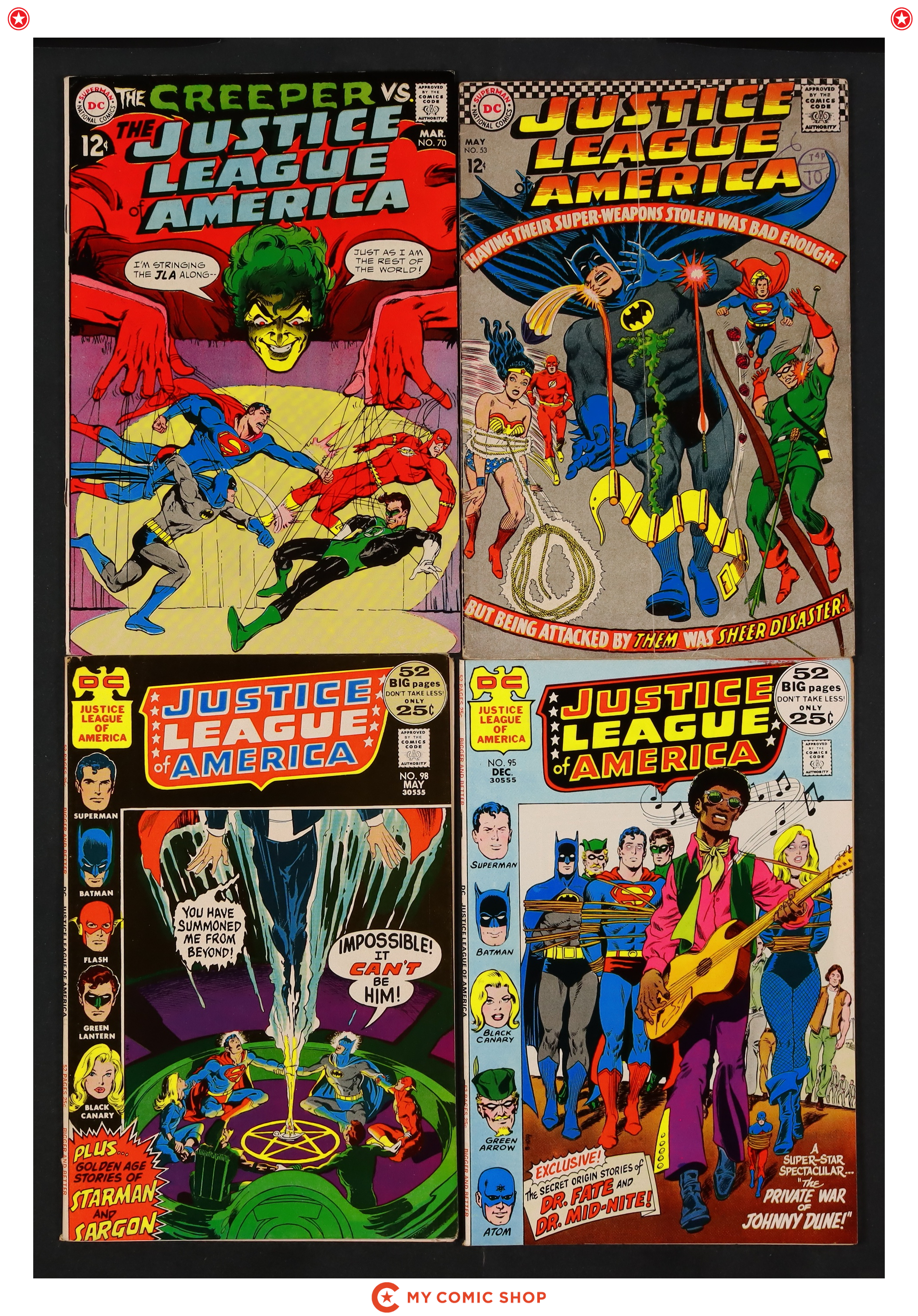 Issues 53, 70, 95, 98 of Justice League of America (1960 1st Series). Most will grade in the FN- to VF- range, with 53 grading at GD/VG.