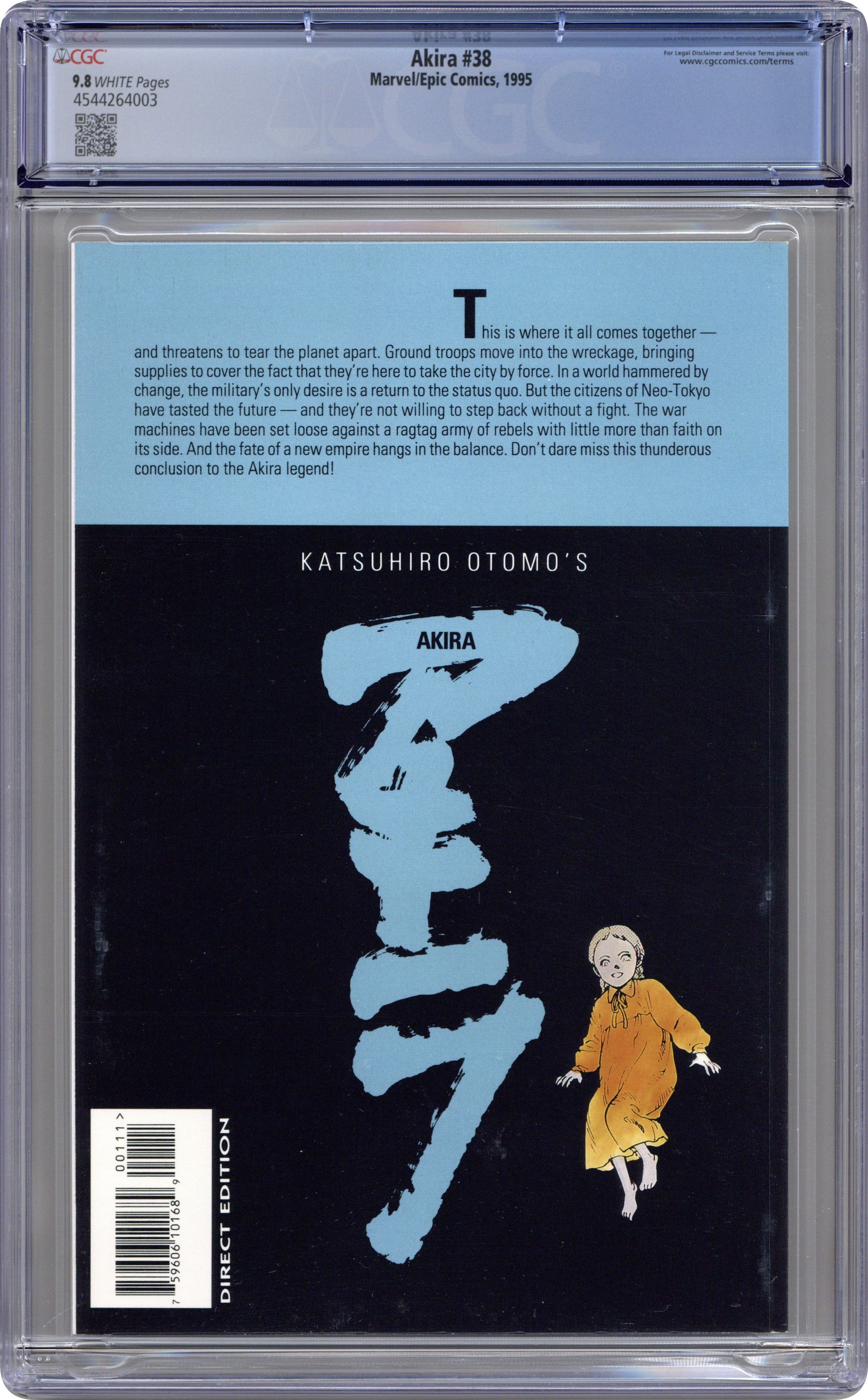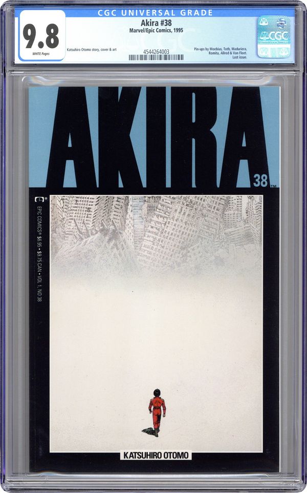 After the battle, UN forces explore whats left of Neo-Tokyo. The first English translation of Katsuhiro Otomos influential manga series. Story, art and cover by Otomo. Color by Steve Oliff. Includes a bonus story written by Larry Hama with art by Bret Blevins, another written by Warren Ellis with art by Terry Shoemaker, and a pinup gallery featuring Moebius, Joe Madureira, George Pratt, Mike Allred, John Romita, Alex Toth, Kevin O'Neill and John Van Fleet. Final issue of the series. Mature readers. Cover price $6.95. Cover price $6.95. Grade: CGC 9.8 explanation of grade Condition: Used (collectible)