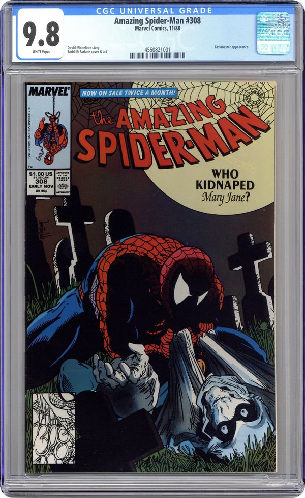 Direct Edition. "Dread" Part 1 of 2. Script by David Michelinie. Art by Todd McFarlane. Cover by Todd McFarlane. Mary Jane is missing! Kidnapped by her psychotic downstairs neighbor Jonathon Caesar! But her despondent husband doesn't know that! So, a fighting mad web-slinger launches a furious search across the city! An errant clue leads the wall-crawler to a rundown Brooklyn cemetery and a reunion with an old foe! Does the Taskmaster stand a chance vs. the determined Spider-Man? The crafty villain is in the wrong place at the wrong time tonight! Cameo appearances by Aunt May, Sergeant Tork, and the Black Cat. (Note: Spider-Man previously clashed with the Taskmaster in Marvel Team-Up 103.) 36 pages Cover price $1.00. Grade: CGC 9.8 explanation of grade Condition: Used (collectible)