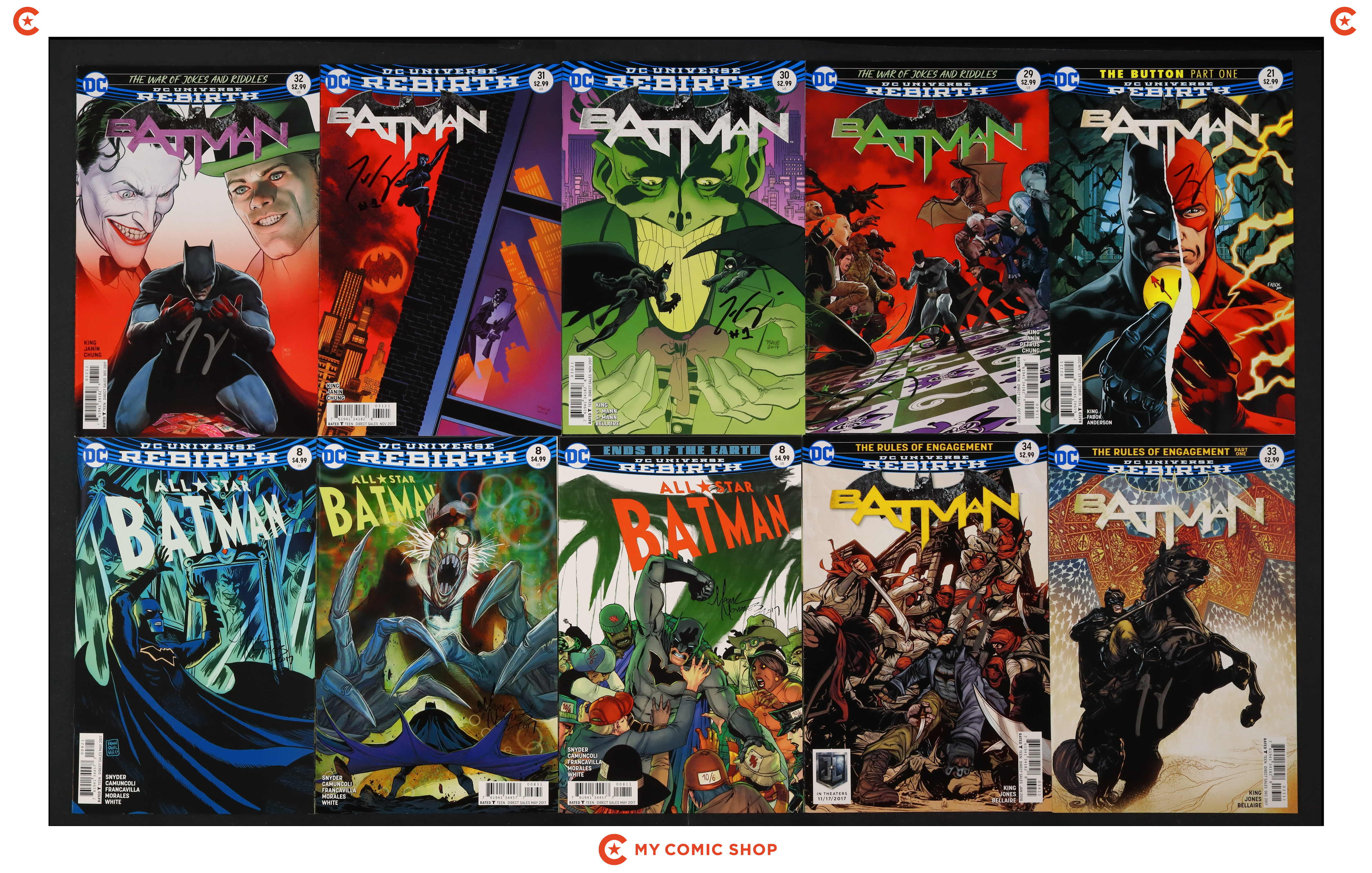 Issues 21B, 29A, 30B, 31B, 32A-34A of Batman (2016 3rd Series); and 8A, 8B, 8C of All Star Batman (2016). Signed by Tom King, no certification is included. Most will grade in the VF- to NM- range.