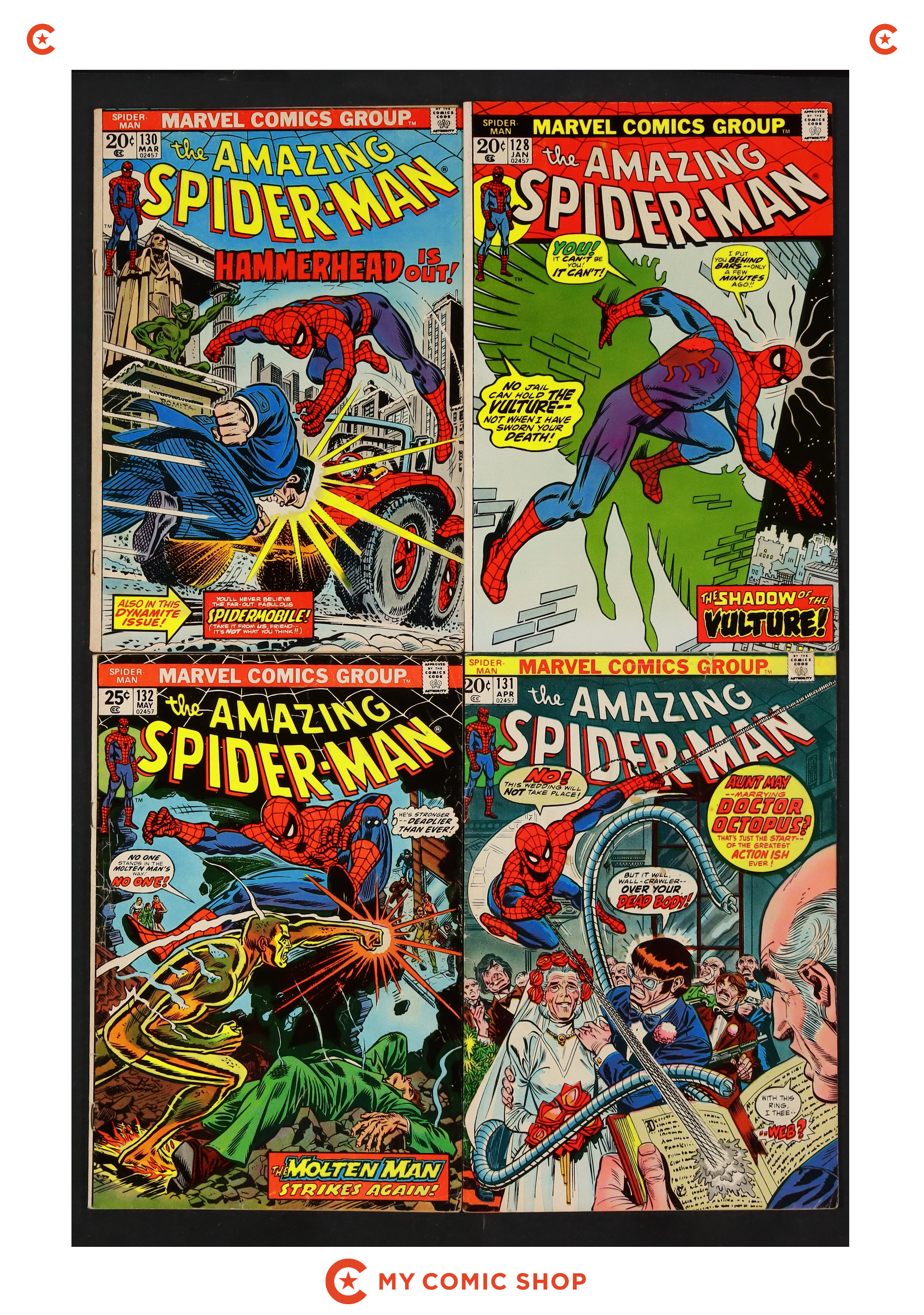 Issues 128 and 130-132 of Amazing Spider-Man (1963 1st Series). Most will grade in the VG to GD range.