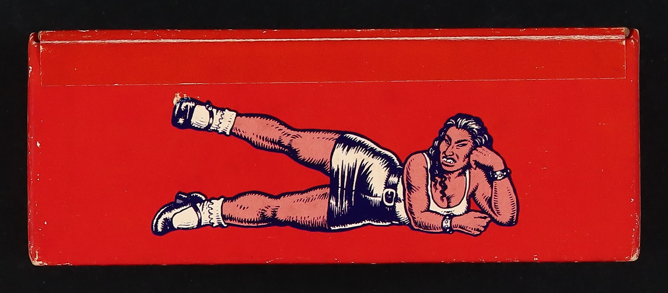 Created in 1994 to promote the release of the documentary Crumb and modelled after cigar boxes, this unique piece features art from Crumb on all sides as well as a special message from the artist to wholesalers on the bottom indicating that Gen X'ers 'want nothing more than to be BAD'. Box displays some scuffing to the exterior and some foxing/residue on the interior. 6 3/4" x 5 1/2" x 2 1/2".