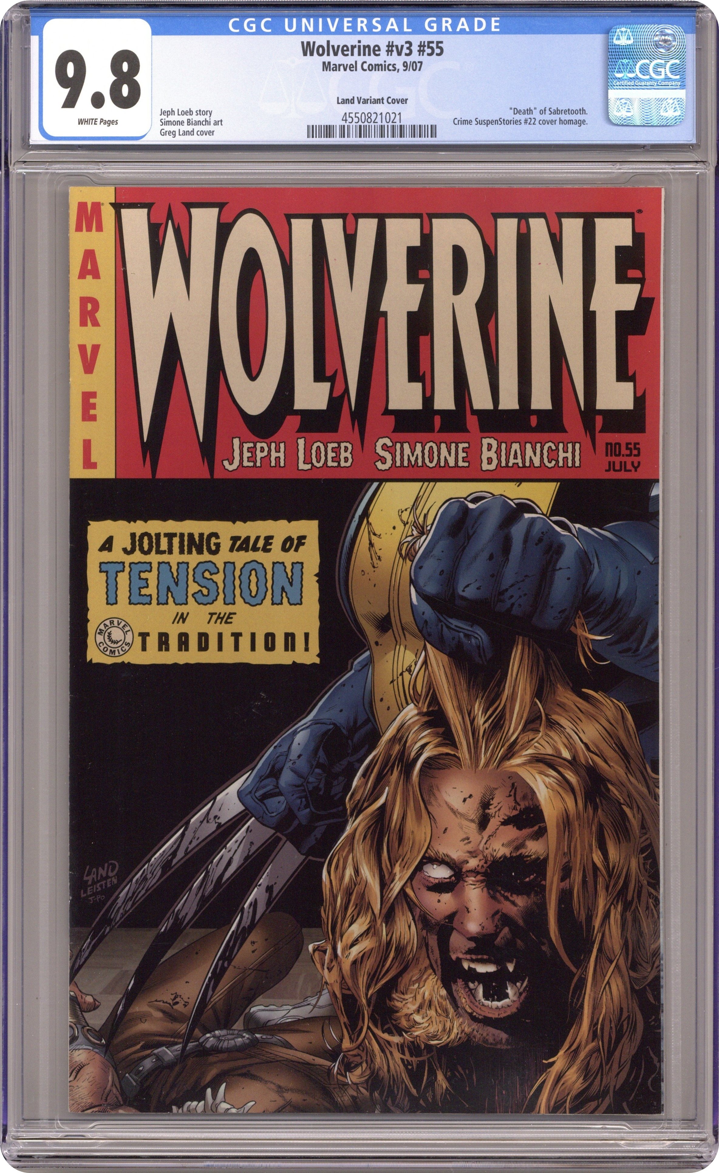 Variant Cover by Greg Land. Written by JEPH LOEB Pencils by SIMONE BIANCHI It's time for the final round in Wolverine's decades-long grudge match with Sabretooth, courtesy of superstars Jeph Loeb (Batman: Hush) and Young Guns reloaded artist Simone Bianchi -- and this time only one of them is walking away. Get ready for one of the most eye-popping endings in recent Marvel history, True Believer! 32 PGS./Parental Advisory Cover price $2.99. Grade: CGC 9.8 explanation of grade Condition: Used (collectible)
