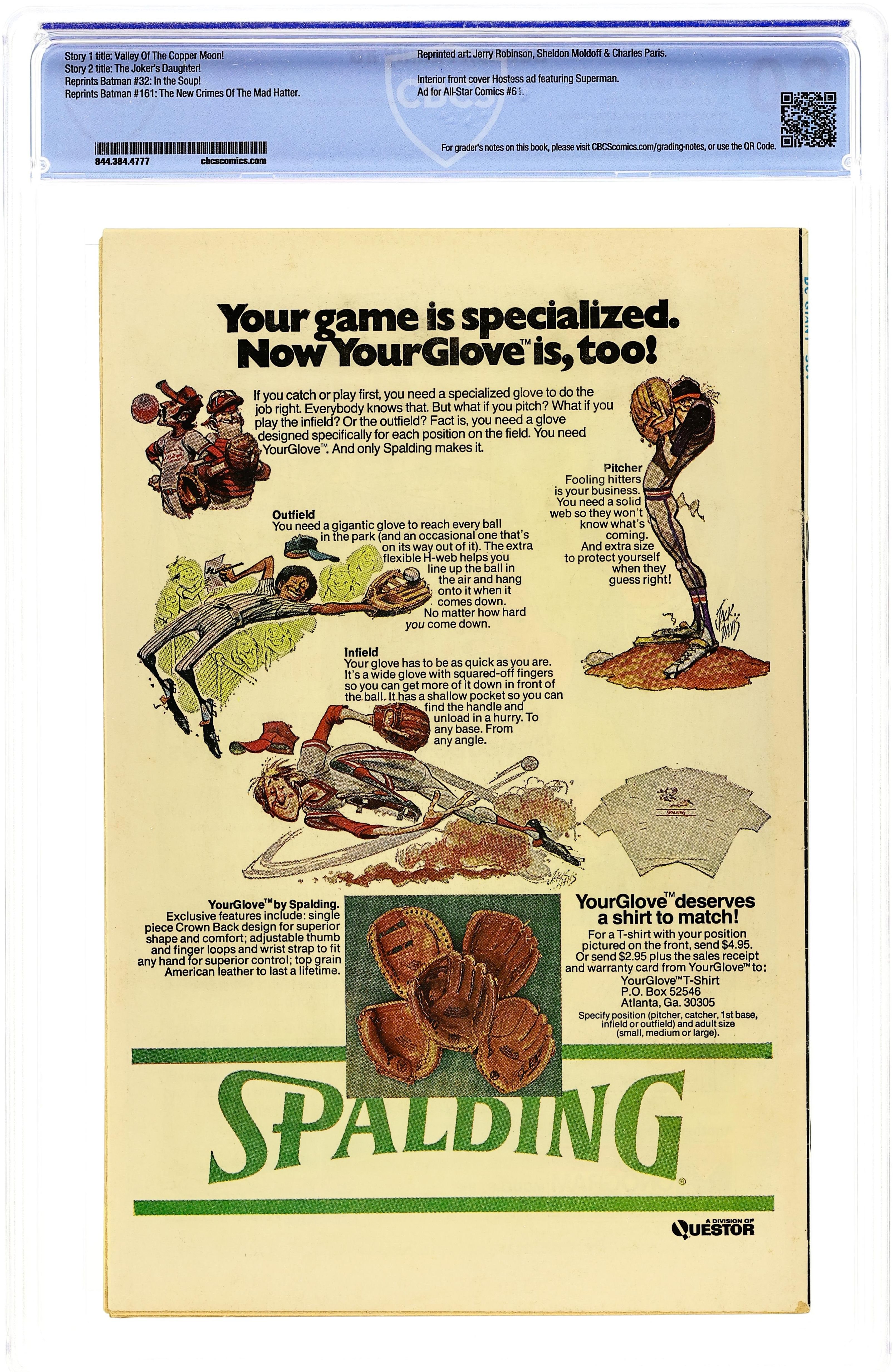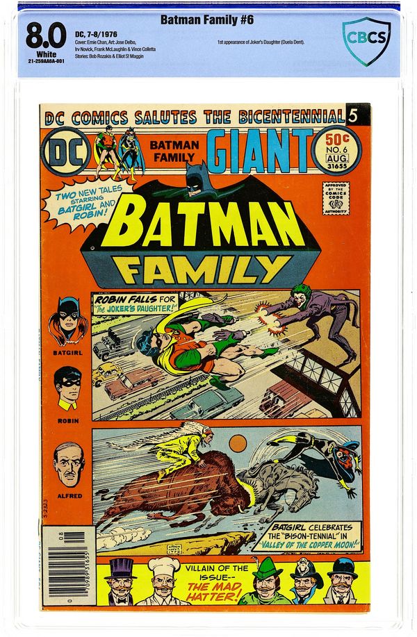 Ended Jun 23 2025 Winning Bid $36 Giant-size issue. Batgirl stars in "Valley of the Copper Moon!" Script by Elliot Maggin, pencils by Jose Delbo, inks by Vince Colletta. Robin stars in "The Joker's Daughter!" Script by Bob Rozakis, pencils by Irv Novick, inks by Frank McLaughlin (1st appearance). Reprint back-up stories: Alfred stars in "In the Soup!" with art by Jerry Robinson (from Batman 32); Batman and Robin star in "The New Crimes of the Mad Hatter" (from Batman 161). Ernie Chan (as "Ernie Chua") cover. Cover price $0.50. Grade: CBCS 8.0 explanation of grade Condition: Used (collectible)