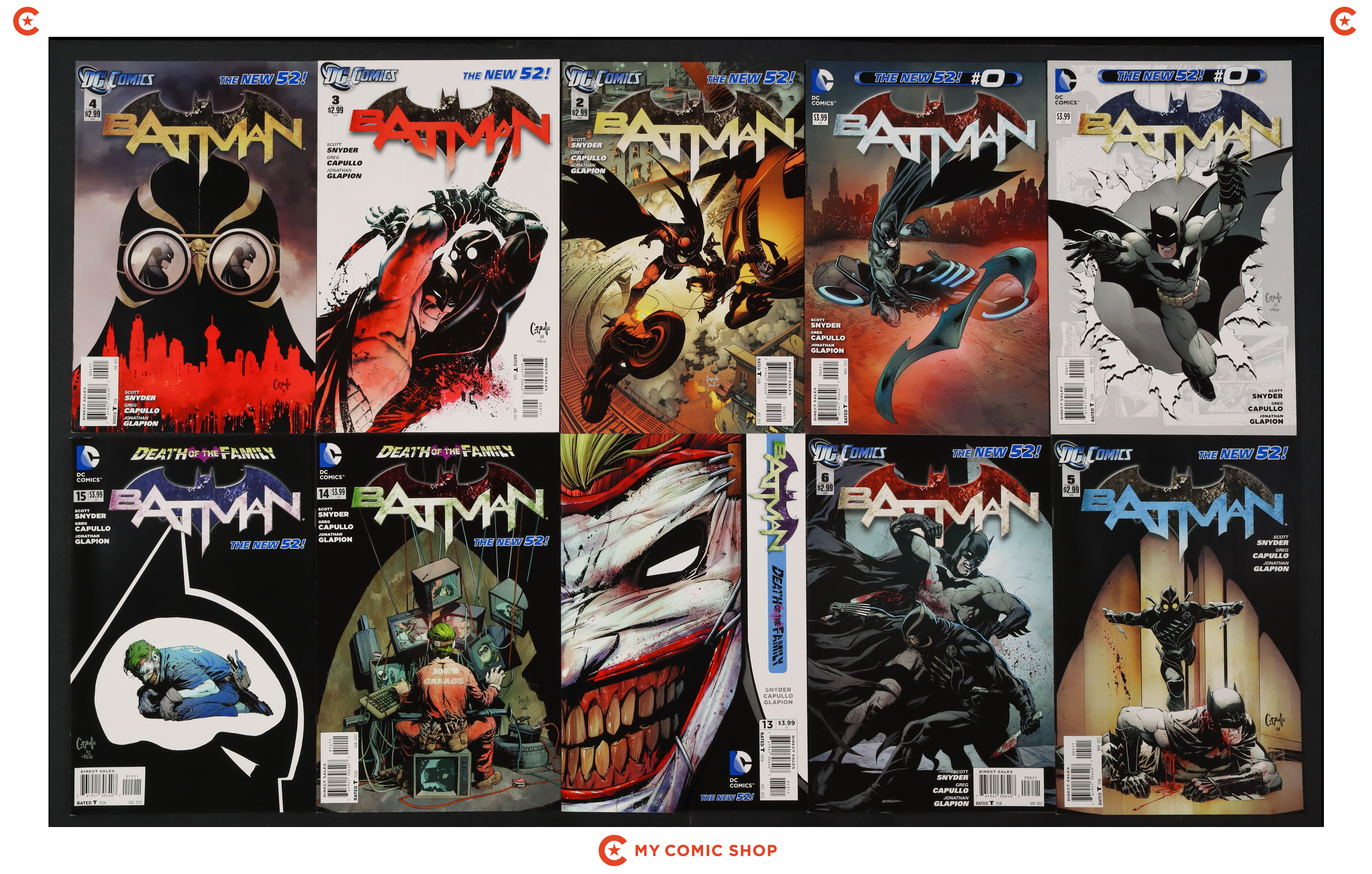 Issues 0A, 0B, 2A, 3A, 4A, 5A, 6B, 13A-15A of Batman (2011 2nd Series). Most will grade in the VF- to NM- range.