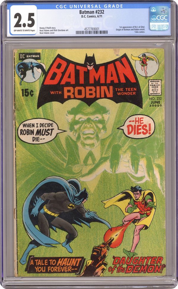 Ended Jun 17 2025 Winning Bid $225 1st appearance of Ra's Al Ghul. Last 15-cent cover price. Cover by Neal Adams. "Daughter of the Demon," script by Denny O'Neil, pencils by Neal Adams, inks by Dick Giordano; Origin of Batman and Robin retold; Robin returns home from a night of adventuring; Two gunmen armed with tranquilizer darts shoot the Boy Wonder and take him prisoner; Later, Bruce Wayne receives a photograph of his kidnapped partner and a challenge to find him; Ra's Al Ghul contacts deduce that Bruce Wayne and the Batman are one in the same; He calls upon the world's greatest detective to help him find his daughter Talia, who also has been kidnapped. Letter to the editor by Mike W. Barr. 36 Pages, Full Color. Cover price $0.15. Grade: CGC 2.5 explanation of grade Condition: Used (collectible)