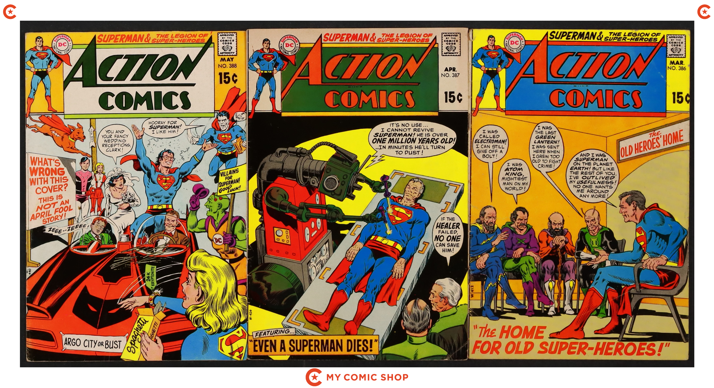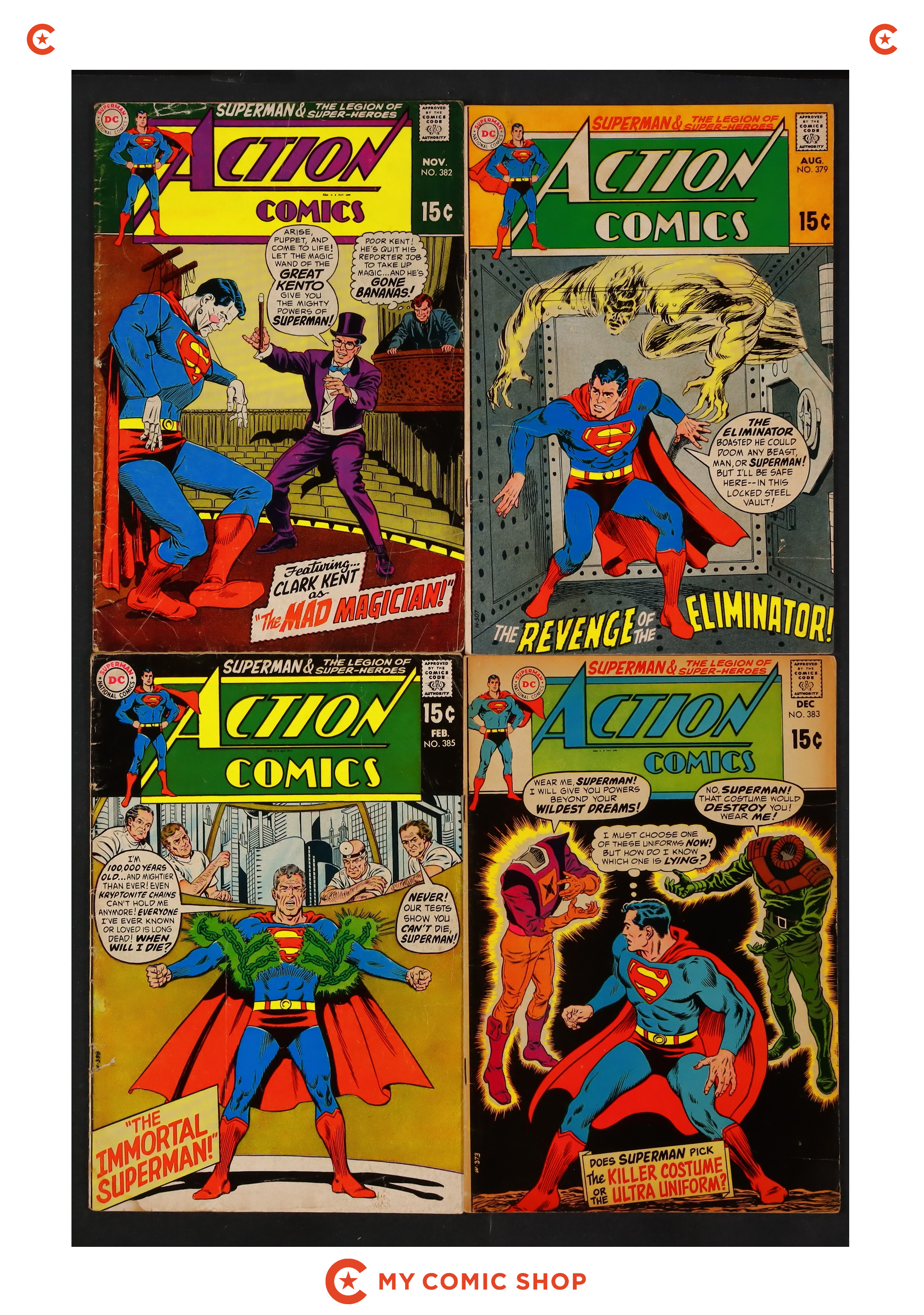 Issues 379 and 382, 383, and 385-388 of Action Comics (1938 DC). Most will grade in the VG to GD range.