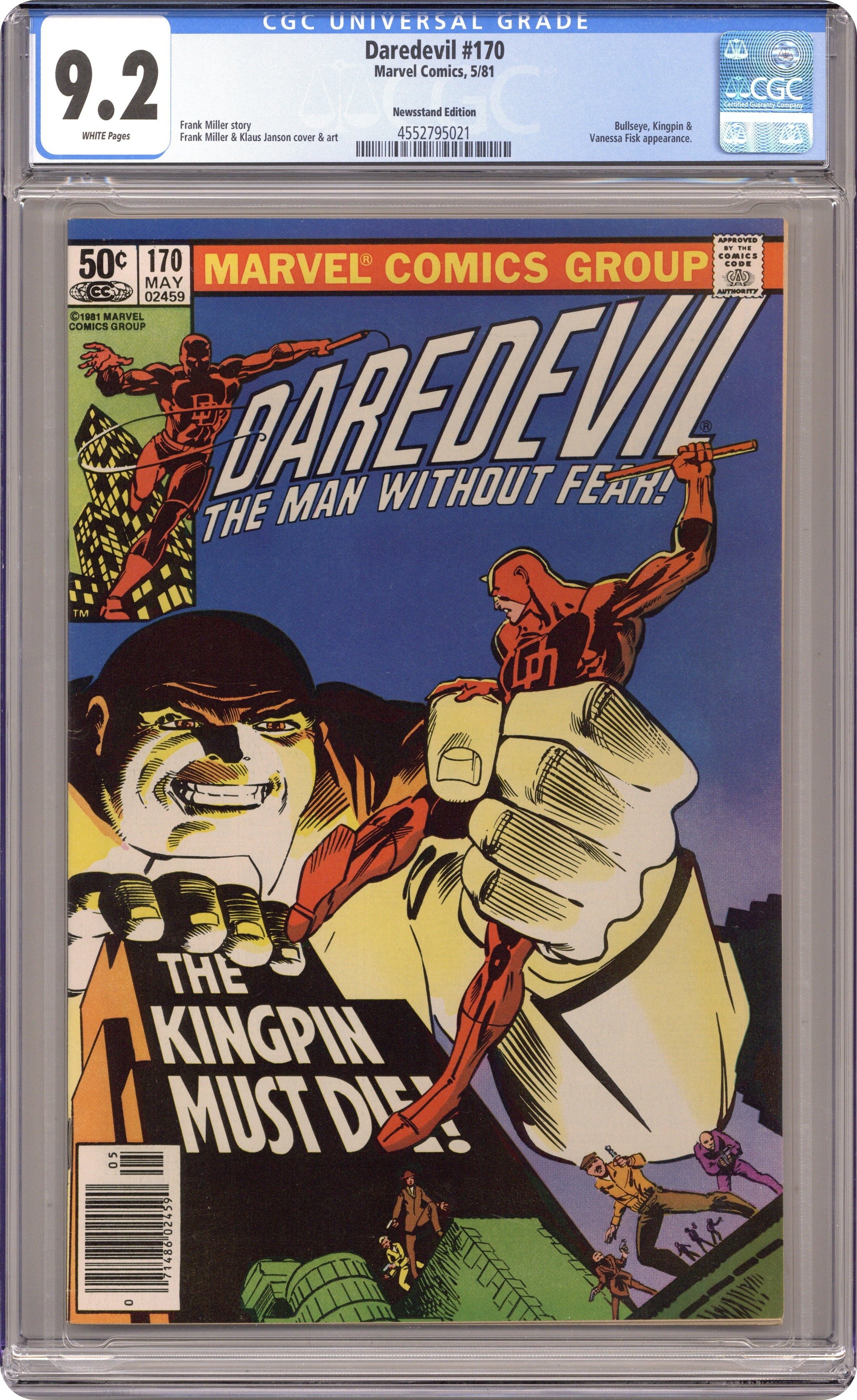 Newsstand Edition. Cover pencils by Frank Miller, inks by Klaus Janson. The Kingpin Must Die, script by Frank Miller, pencils by Frank Miller, inks by Klaus Janson; Kingpin, retired in Japan, sends his wife to New York to hire Nelson and Murdock so he can turn states evidence against the East Coast crime bosses; Vanessa is captured by the mob so they can lure Kingpin back to New York so they can kill him; Daredevil gets in the way and has a confrontation with Bullseye. 32 pgs. Cover price $0.50. Cover price $0.50. Grade: CGC 9.2 explanation of grade Condition: Used (collectible)