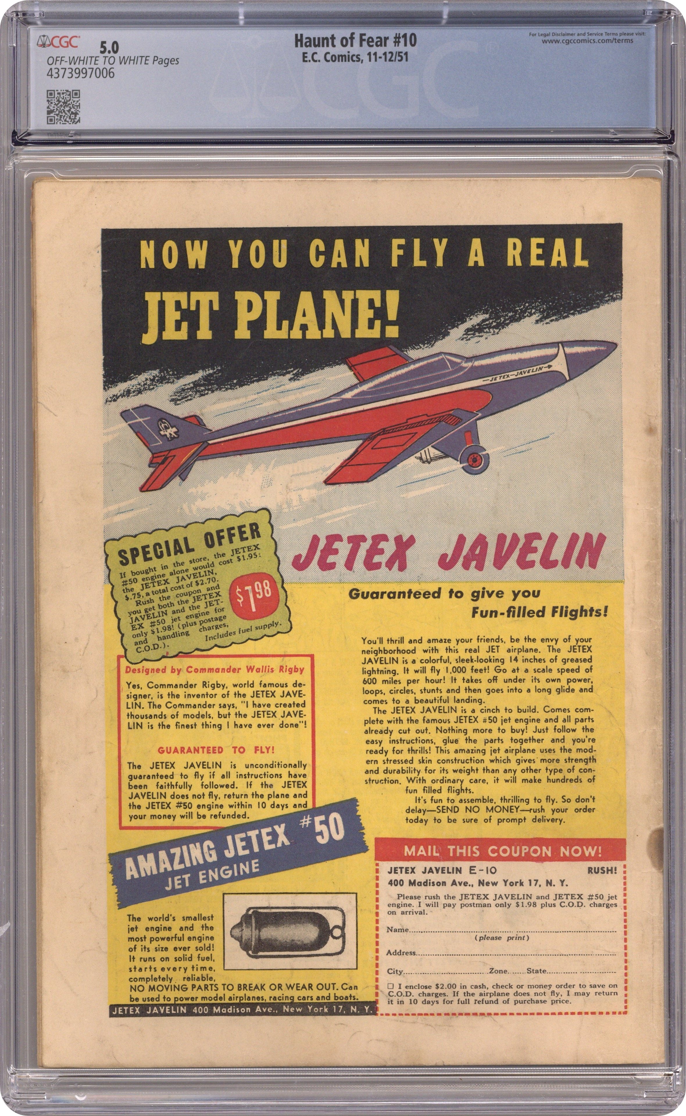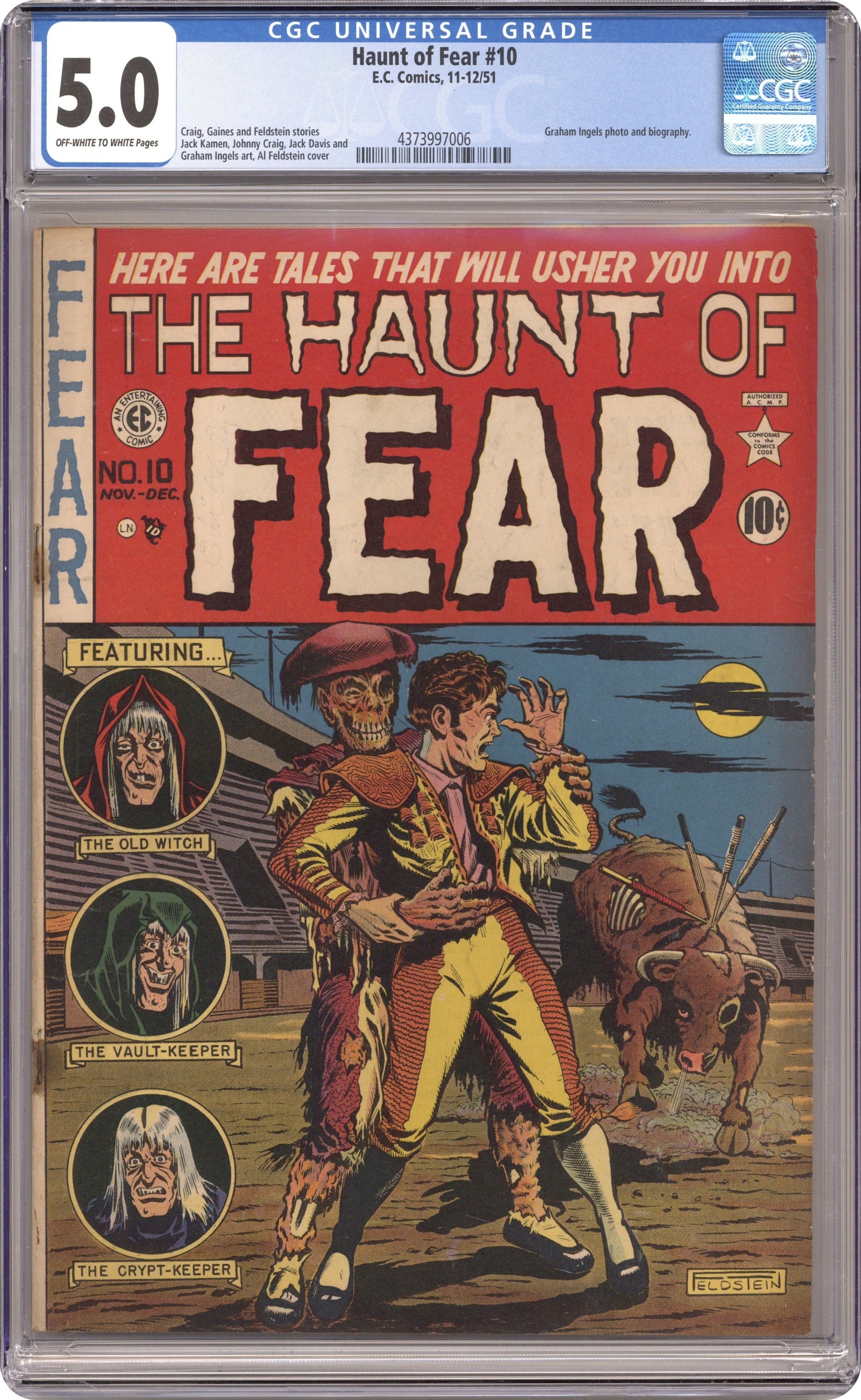 Cover art by Albert B. Feldstein. The E.C. Artist of the Issue - Graham Ingels photo and bio. Grave Business!--The Witch's Cauldron!, script by Albert B. Feldstein, art by Graham Ingels; An undertaker who overcharges for his services becomes paralyzed in an auto accident and buried alive because his partner doesn't bother to embalm him and uses all the tricks he learned while working with the victim to bilk the estate for the funeral costs. The Vamp!--The Vault of Horror!, script by Johnny Craig, pencils by Johnny Craig (pages 1-4) and Jack Davis (pages 5-7), inks by Jack Davis; A man and wife go on vacation in Europe where he meets a vampire that falls in love with him; Once he learns what she is he rejects her in disgust and she angrily replies that she'll kill him before she lets him go back to his wife. My Uncle Ekar!--Haunt of Fear, script by Albert B. Feldstein, art by Jack Kamen. Bum Steer!--The Crypt of Terror, script by Albert B. Feldstein, art by Jack Davis. 36 pages, full color. Cover price $0.10. Grade: CGC 5.0 explanation of grade Condition: Used (collectible)