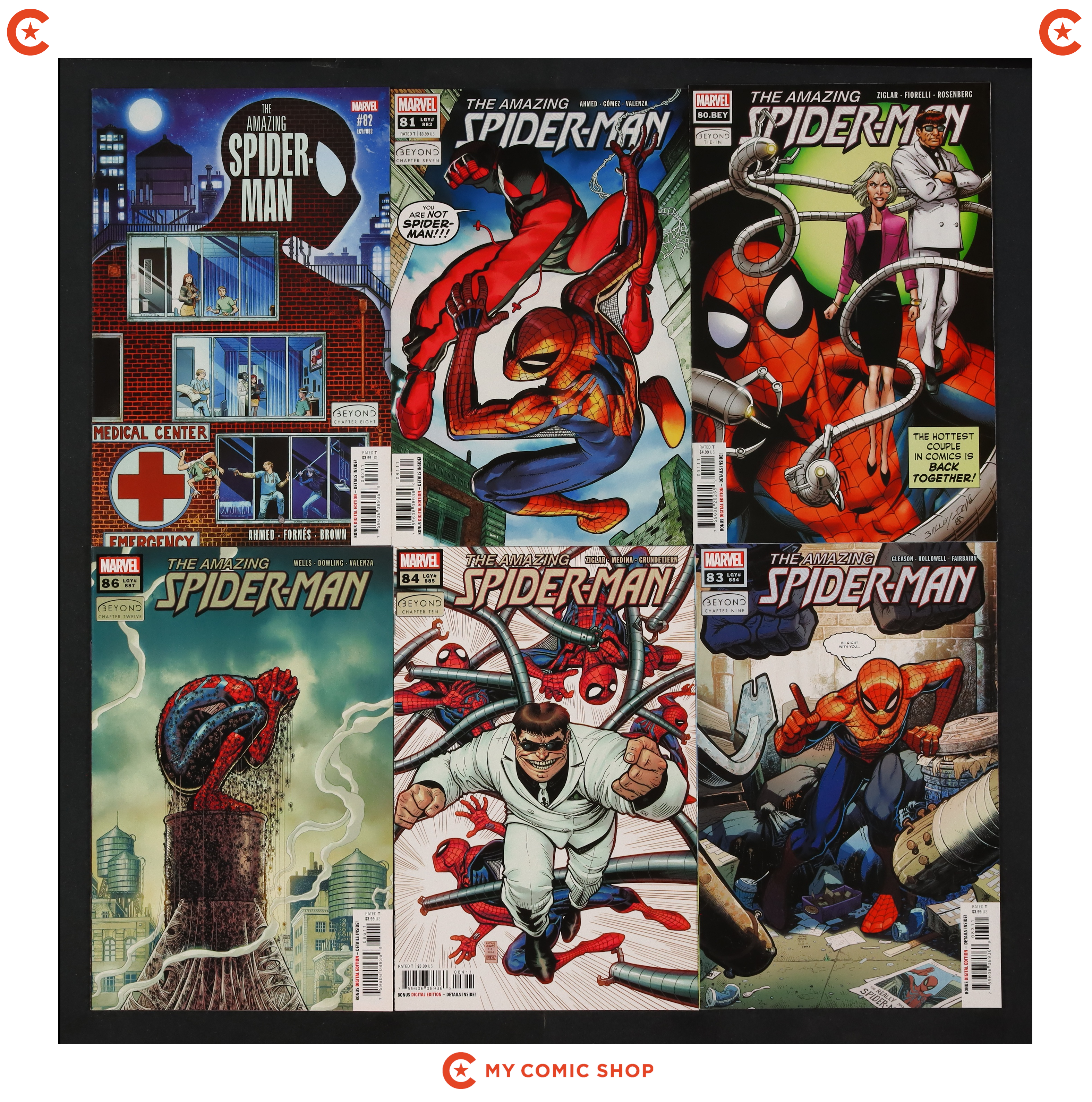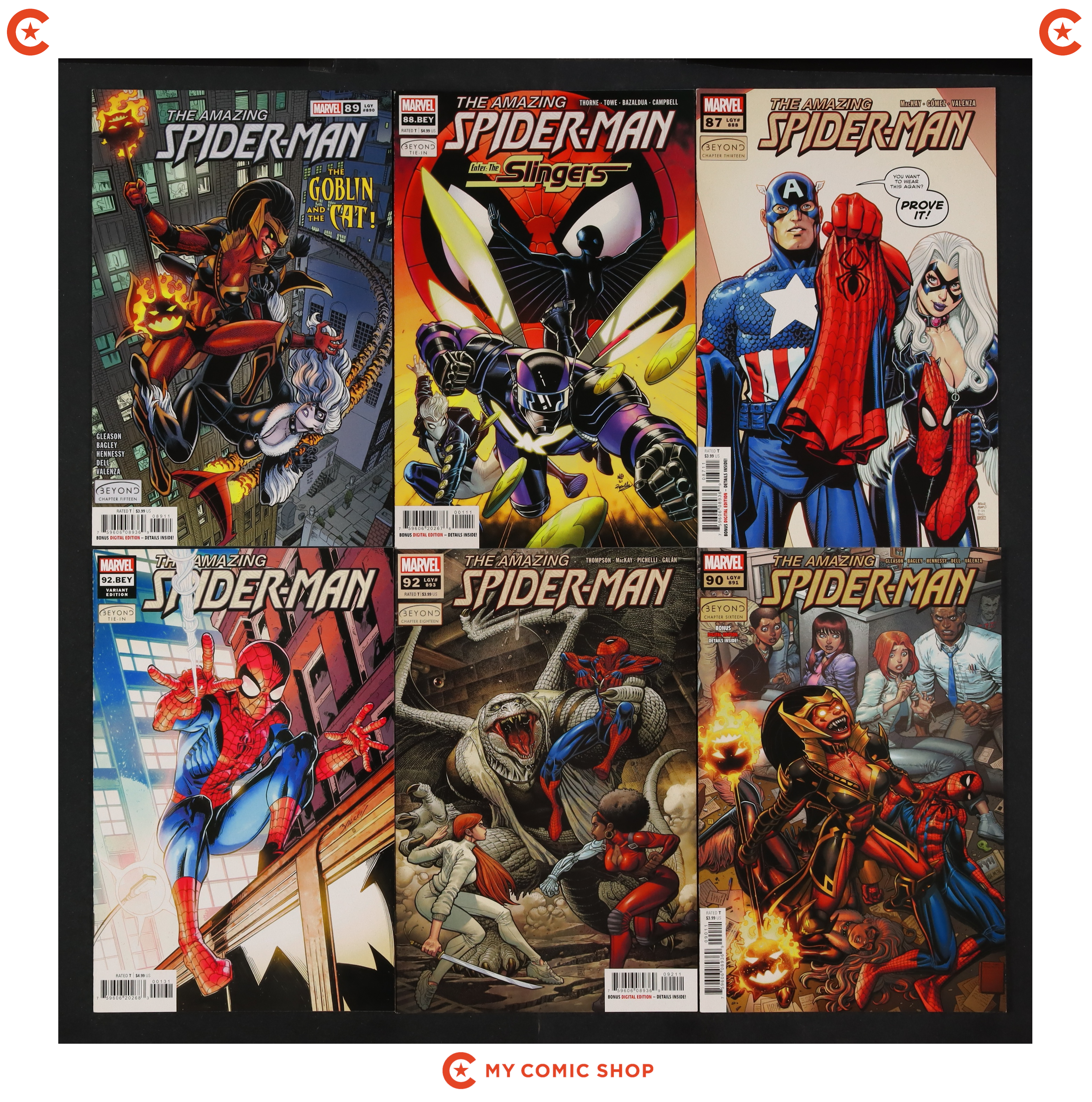 Issues 80BEY.A, 81A, 82A, 83A, 84A, 86A, 87A, 88BEY.A, 89A, 90A, 92A, 92BEY.C of Amazing Spider-Man (2018 6th Series). Most will grade in the VF+ to NM range.