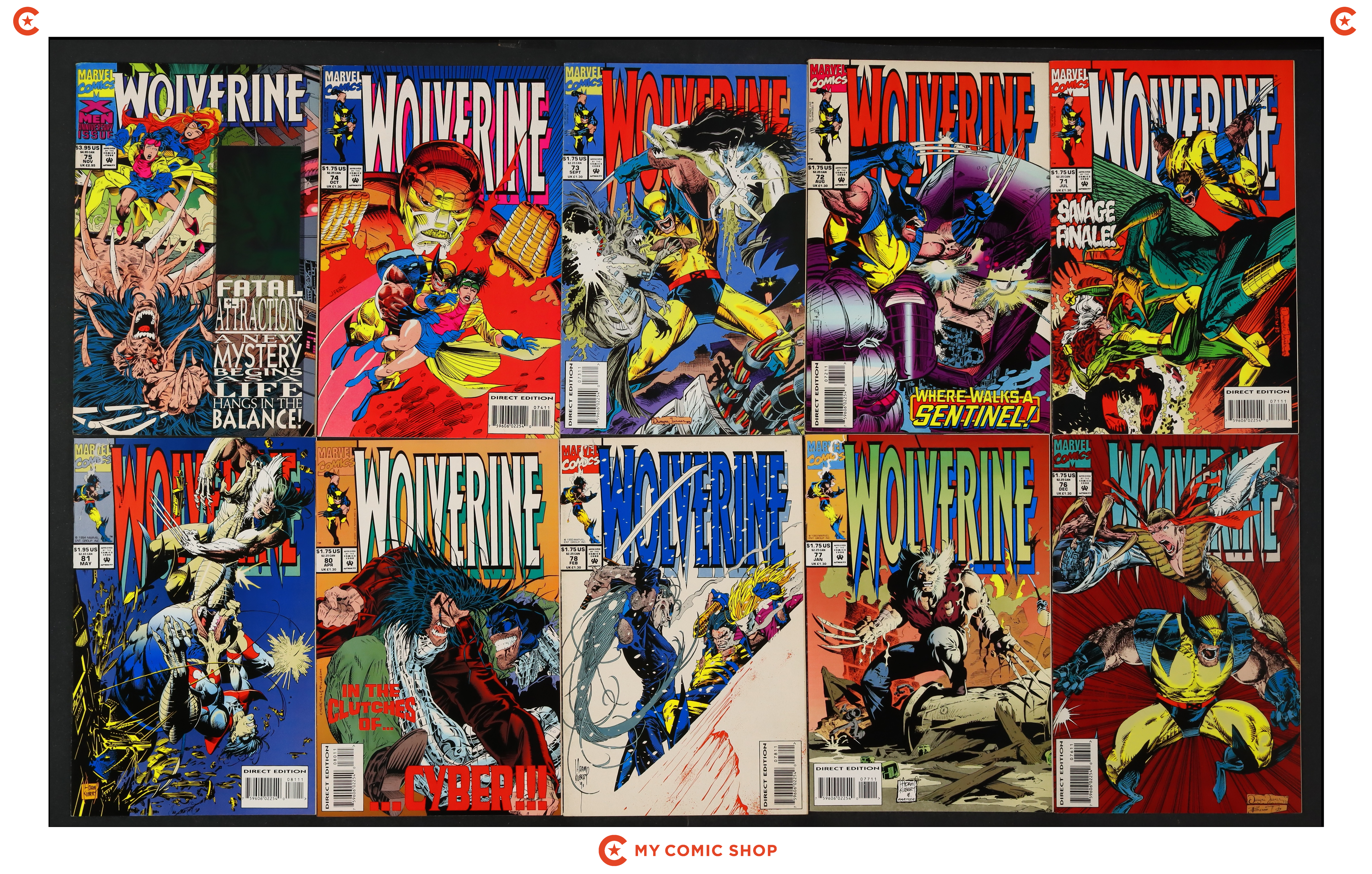 Issues 71-75D, 76D-78D, 80, 81 of Wolverine (1988 1st Series). Most will grade in the FN to VF range with 75D grading VG.