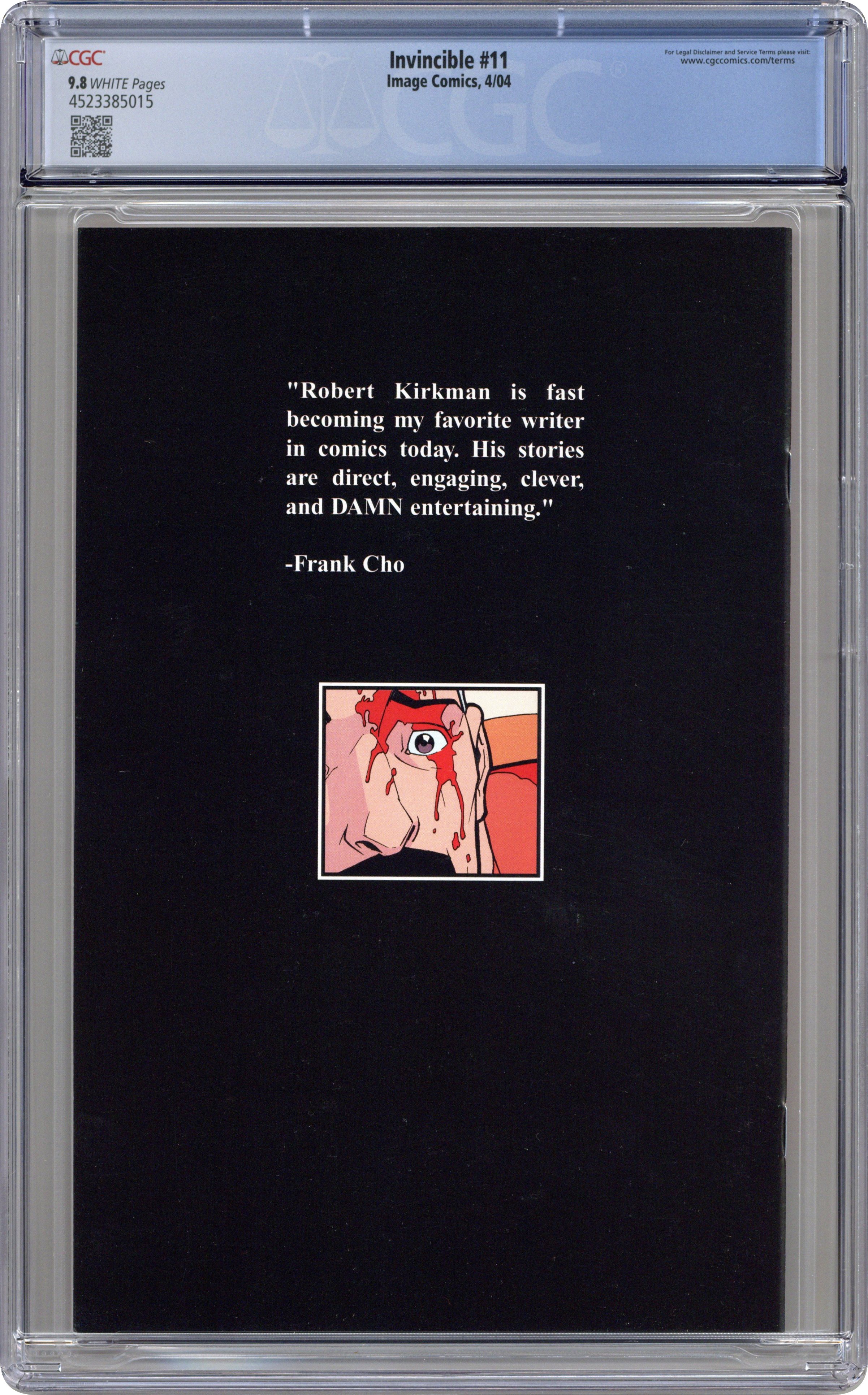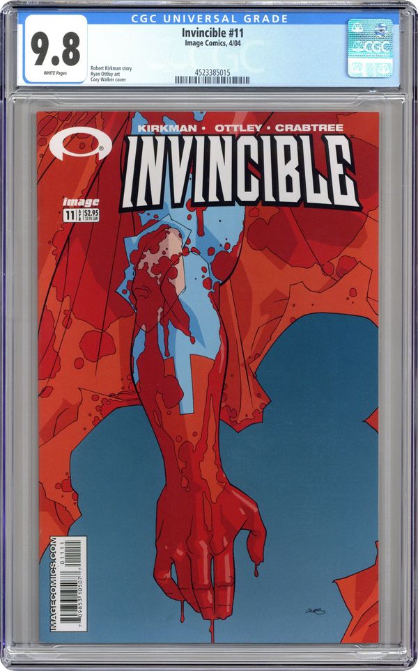 Written by ROBERT KIRKMAN Art by RYAN OTTLEY Cover by CORY WALKER FC 32 pgs. $2.95 Monthly ongoing series On sale 24 MARCH, 2004 THE CONCEPT: Mark Grayson is just like most everyone else his age, except for the fact that his father is the most powerful superhero on the planet. And now he's begun to inherit his father's powers. It all sounds okay at first, but how do you follow in your father's footsteps when you know you will never live up to his standards? THIS ISSUE: "Perfect Strangers," Part Three?The status quo becomes a thing of the past when Mark's world is torn apart before his eyes. How will he pick up the pieces? Events in this issue lead into our big issue 12 spectacular! Don't miss it! Cover price $2.95. Grade: CGC 9.8 explanation of grade Condition: Used (collectible)