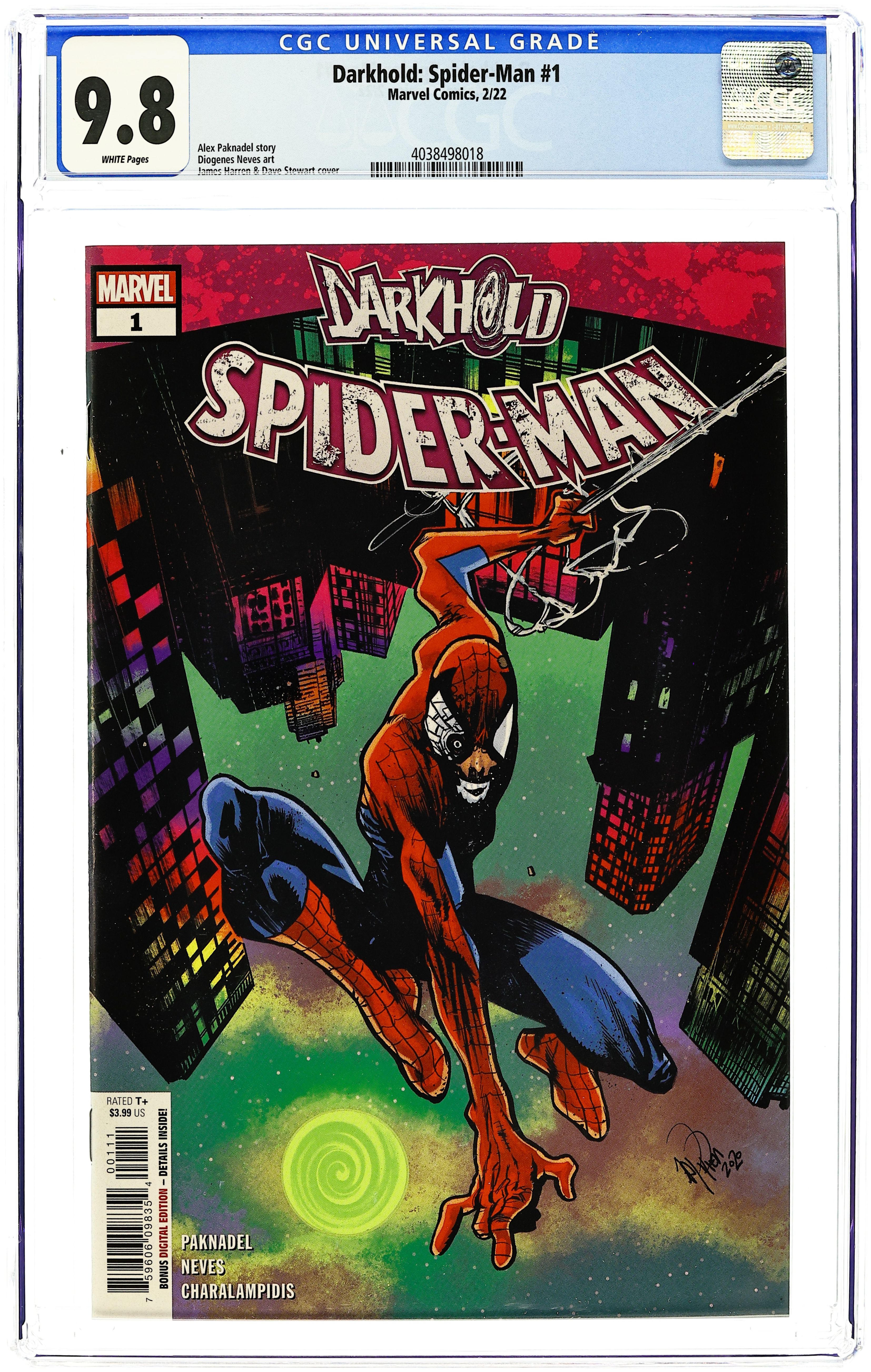 Written by Alex Paknadel. Art by Diogenes Neves. Cover by James Harren. THE SPIDER TRAPPED IN A WEB OF HIS OWN MAKING! After reading from the ancient Darkhold, Spider-Man was meant to gain the power to enter the dread Chthon's dimension and stop him from spreading his mythic darkness across the globe. Instead the book drove him insane - but what does that mean for the stalwart Peter Parker? Dive into a warped world of Spider-Man's broken mind! 28 pages, full color. Rated T+ Cover price $3.99. Grade: CGC 9.8 explanation of grade Condition: Used (collectible)