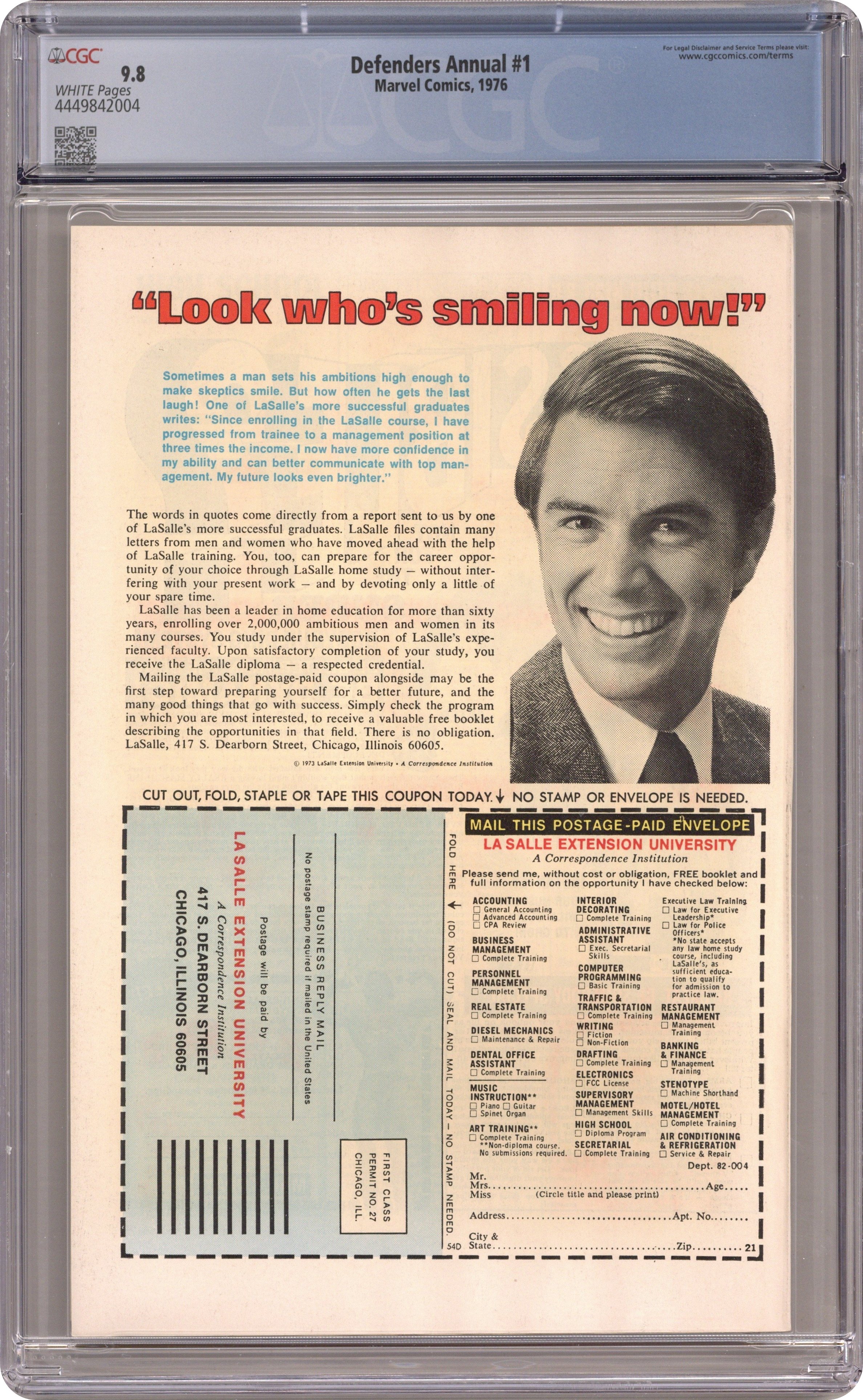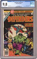 Cover by Al Milgrom and Klaus Janson. "World Gone Sane?" Part 11 of 11. Story continues from Defenders (1972) number 40. Story by Steve Gerber. Pencils by Sal Buscema. Inks by Klaus Janson. In the culmination of a year long story, the Headmen continue their efforts as they attempt a peaceful takeover of the world. Meanwhile, Nebulon is still attempting to save humanity from itself. Caught between all of this are, of course, the Defenders. Plus, are you ready for Jack Norriss, secret agent? 52 pages. Full color. Cover price $0.50. Grade: CGC 9.8 explanation of grade Condition: Used (collectible)