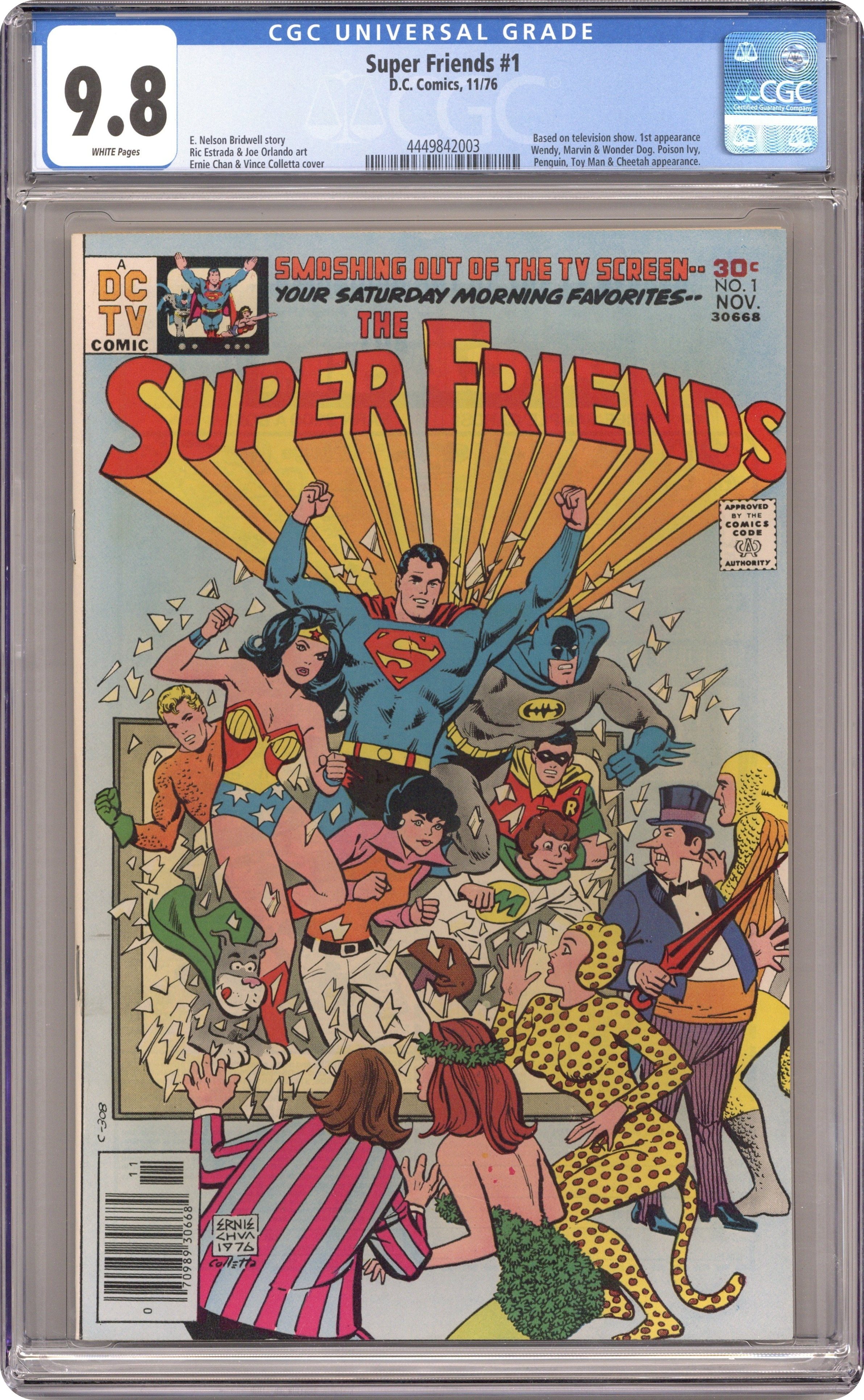 Starts Jan 3 "The Fury of the Super Foes." Aquaman, Batman, Robin, Superman and Wonder Woman attempt to prevent Penguin, Poison Ivy, Cheetah, and others from stealing the components of a super robot. The Super Friends, which are essentially a watered down version of the Justice League, appeared in the Saturday morning animated series of the same name. Script by E. Nelson Bridwell, pencils by Ric Estrada and Joe Orlando, inks by Vince Colletta. Cover by Ernie Chua. Cover price $0.30. Grade: CGC 9.8 explanation of grade Condition: Used (collectible)