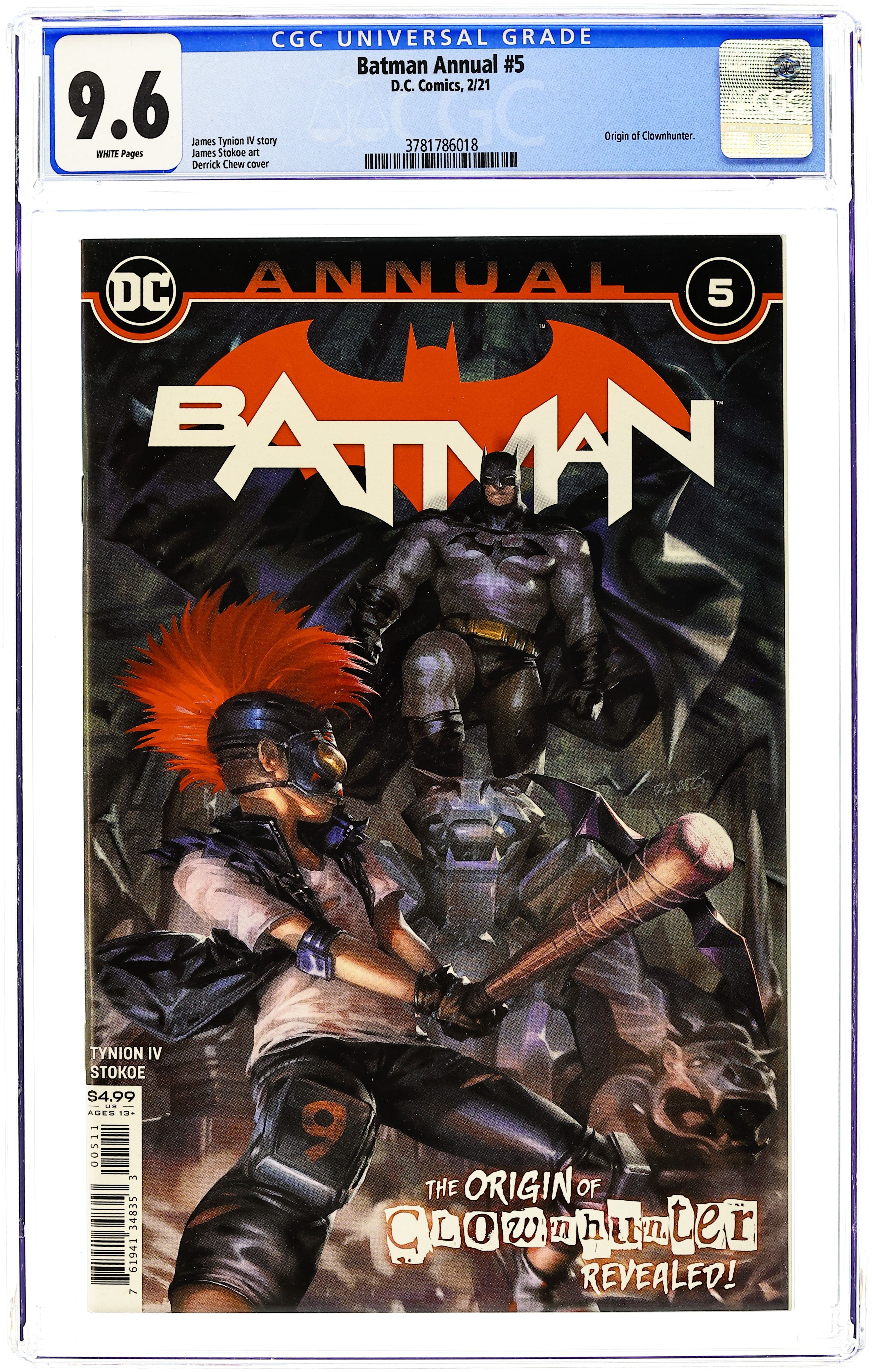 This epic tale reteams writer James Tynion IV and artist James Stokoe, the storytellers behind the definitive Clownhunter tale from Batman: The Joker War Zone #1! 48 pages, full color. Ages 13+ Cover price $4.99. Grade: CGC 9.6 explanation of grade Condition: Used (collectible)