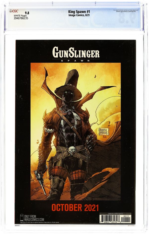 Written by Sean Lewis and Todd McFarlane. Art by Javier Fernandez & Various. Cover by Puppeteer Lee. A historical NEW ongoing SPAWN series begins! The launch of this book, nearly three decades in the making, further expands the SPAWN UNIVERSE with a growing presence of Hell, Heaven, and Heroes here on Earth. A classic villain from Spawn's past has begun asserting his powers on Earth by corrupting as many souls as possible. And only Spawn knows that he even exists. Continuing the dramatic battles from SPAWN'S UNIVERSE #1, this is where it all begins!!!!! Don't miss out...the last time a new ongoing SPAWN series launched was in 1992. 56 pages, full color. Cover price $5.99. Grade: CGC 9.8 explanation of grade Condition: Used (collectible)